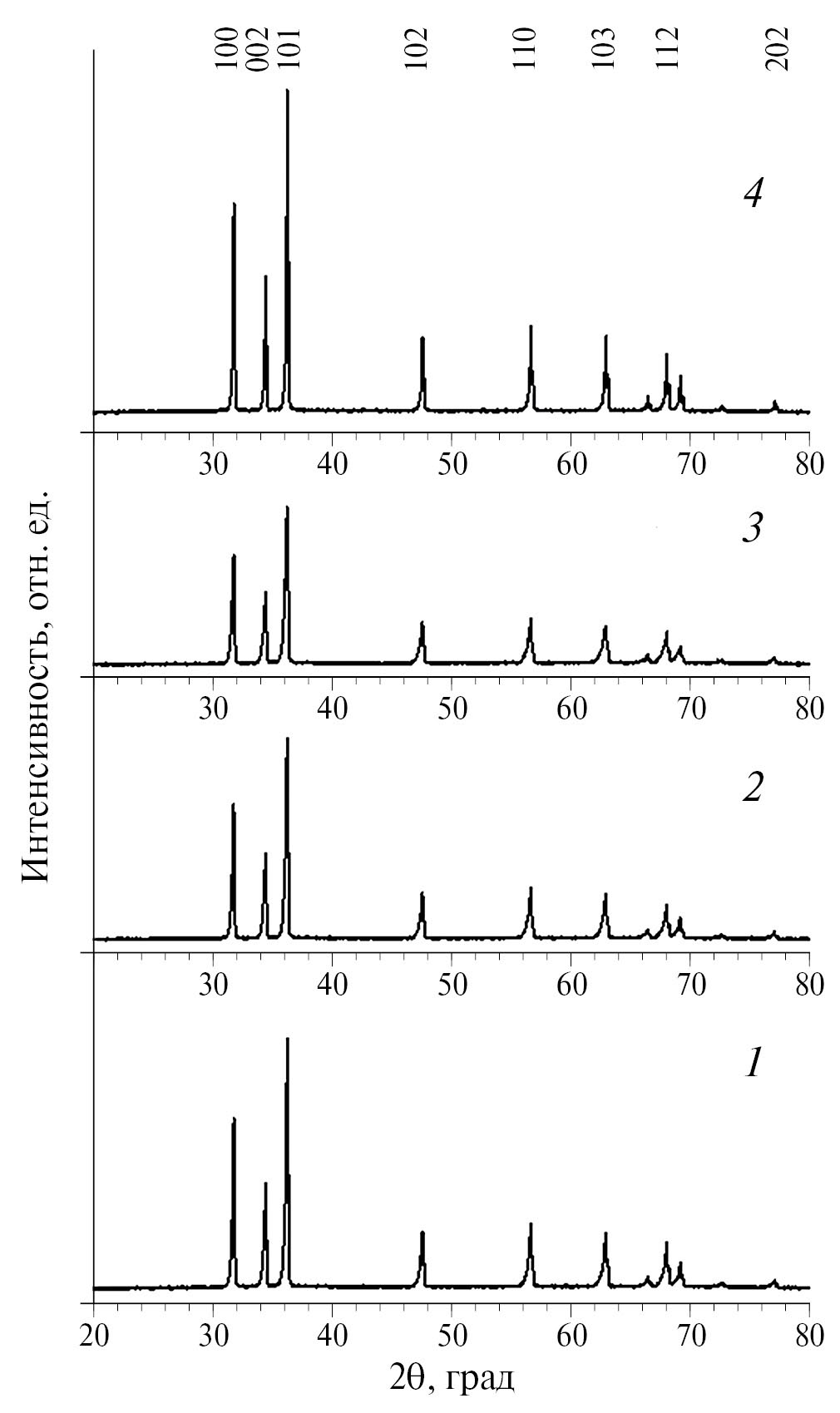 Рис. 3. Дифрактограммы тетраподов ZnO, выращенных в зонах 1–4.