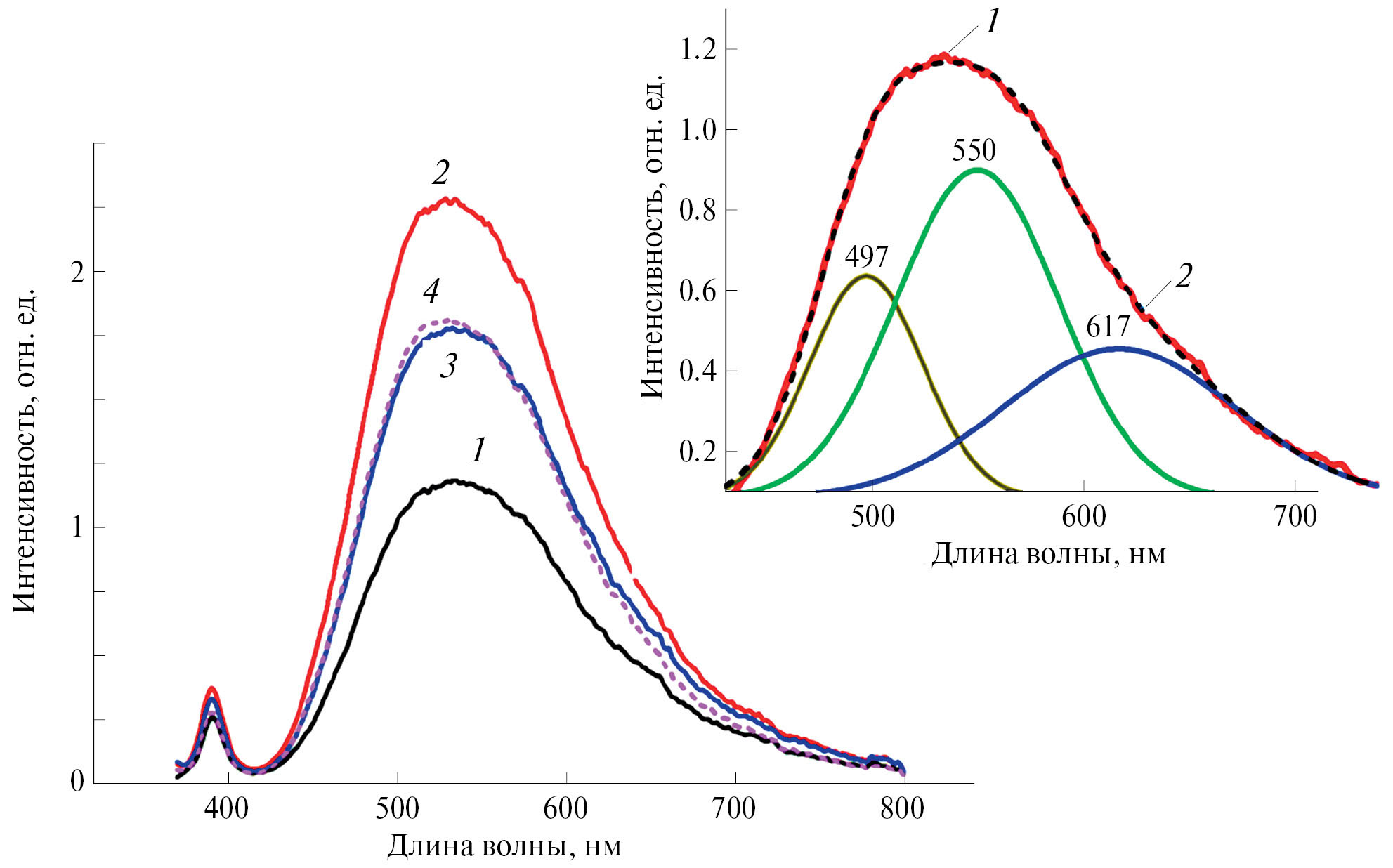 Рис. 4. Спектры ФЛ тетраподов ZnO, выращенных в зонах 1–4 (номера кривых соответствуют номерам зон). На вставке: результат деконволюции зеленой полосы люминесценции тетраподов ZnO (зона 1); сплошная линия 1 – эксперимент, пунктирная 2 – результат подгонки.