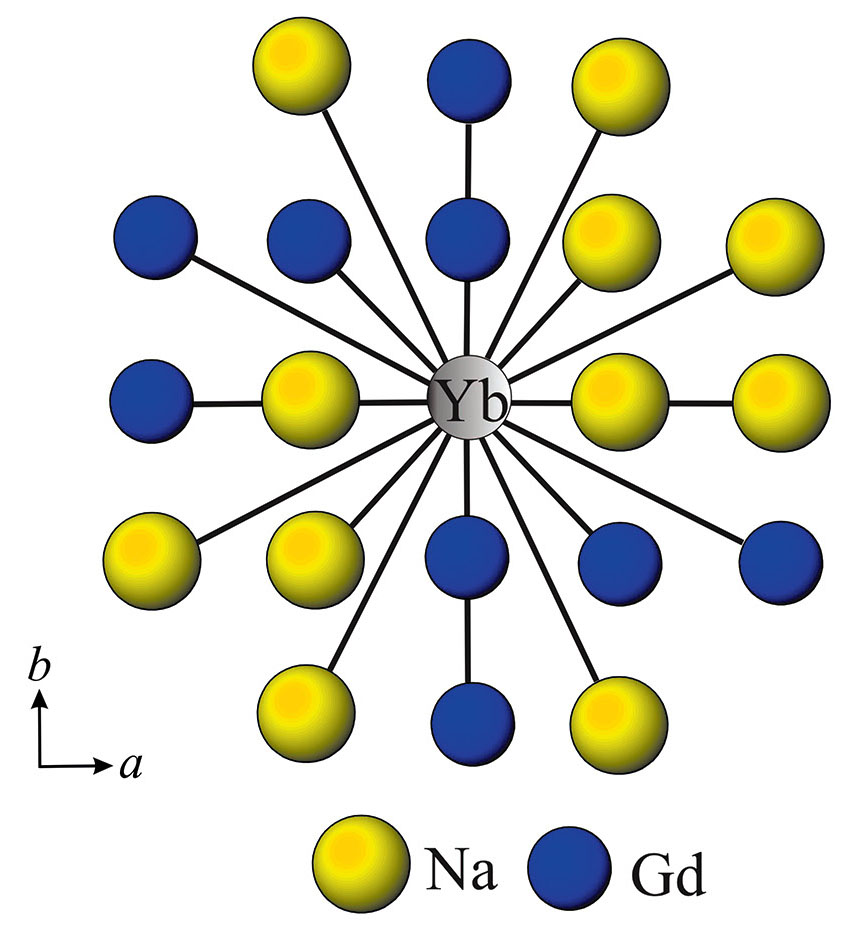 Возможность различной структурной локализации ионов натрия и гадолиния в А-подрешетке делает локальное окружение замещающих их примесных ионов многовариантным. Детально локальное окружение иона европия в NGM исследовано в [31, 32]. Характерной чертой кристаллов NGM является позиционная зависимость энергии дефектов [27]. Так, энергия вакансий для одних и тех же ионов в структуре NGM при разной структурной локализации в сверхъячейке может варьироваться в пределах нескольких процентов [27]. На рис. 2 показан пример возможного окружения примесного иона иттербия ионами натрия и гадолиния в области ~6.9 Å.