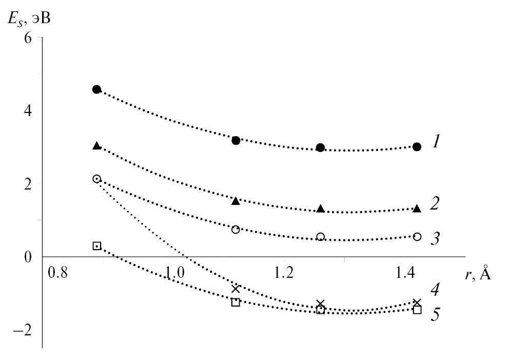 Рис. 4. Зависимость энергии растворения двухвалентных примесей в NGM от их ионного радиуса при разных механизмах растворения: 1, 2, 3, 4, 5 – уравнения (10), (8), (12), (14), (6) соответственно.