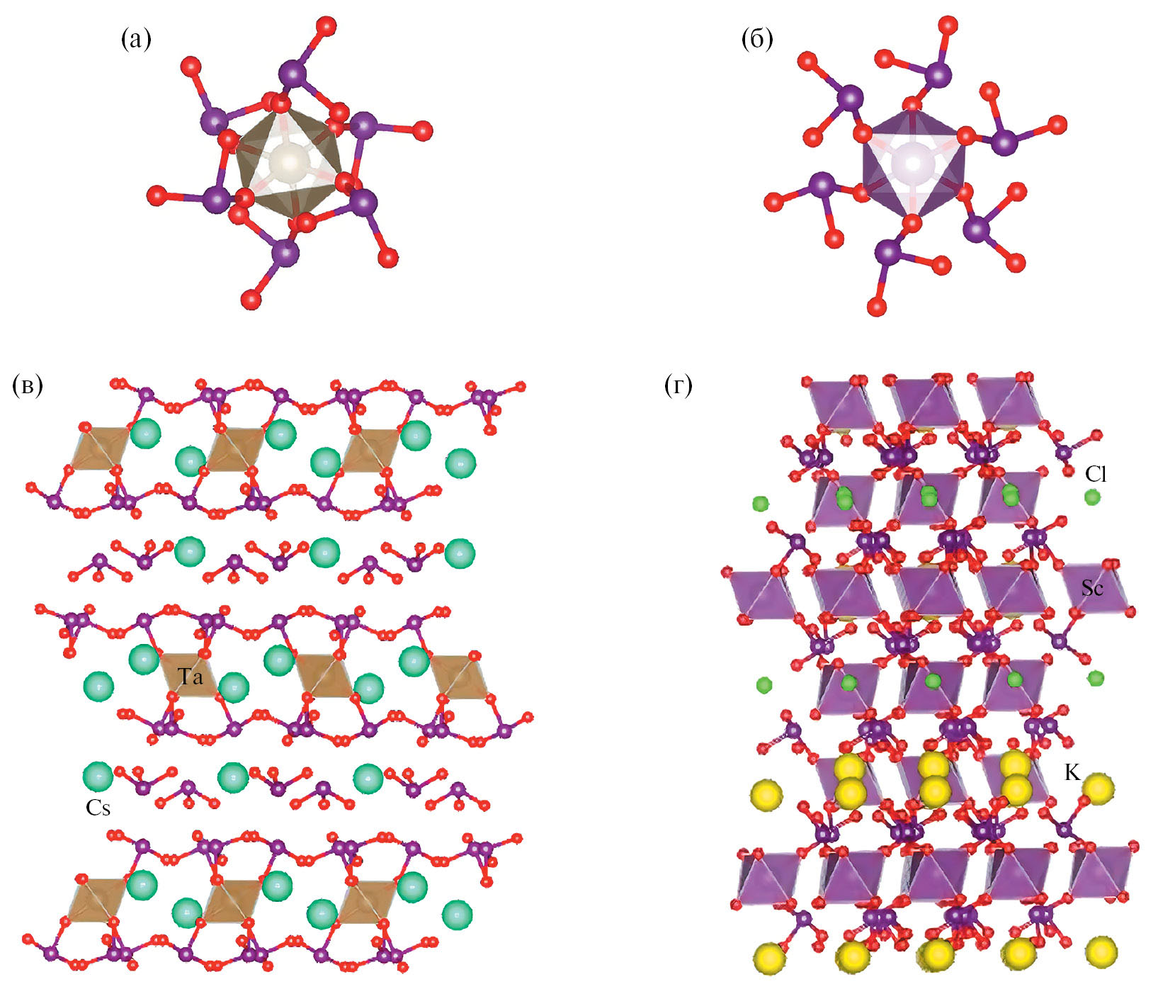 Тригональные структуры с псевдоцентросимметричными блоками. В некоторых случаях блоки [М(IO3)6] в структурах имеют собственную, локальную псевдосимметрию, которая может быть выше симметрии всей структуры. Так, в структуре полученного недавно иодата Cs3Ta(IO3)8 [51], несмотря на ацентричную пр. гр. P31c, имеются изолированные центросимметричные блоки [Ta(IO3)6] с симметрией (рис. 4а). Центр инверсии в них является локальным псевдоэлементом симметрии. Блоки в структуре располагаются на одном уровне, а на другом уровне находятся изолированные группы IO3 (также связанные псевдоцентром инверсии) и один из атомов Cs, нарушающий псевдоцентр инверсии (рис. 4в). Похожая ситуация наблюдается в структуре KSc(IO3)3Cl, пр. гр. R3 [37], где точечная симметрия блоков [Sc(IO3)6] также отвечает точечной группе с псевдоцентром инверсии, отсутствующим как элемент симметрии во всей структуре (рис. 4б). Особенностью структуры KSc(IO3)3Cl является соединение блоков [Sc(IO3)6] в каркас, в полостях которого расположены атомы K и Cl (рис. 4г).