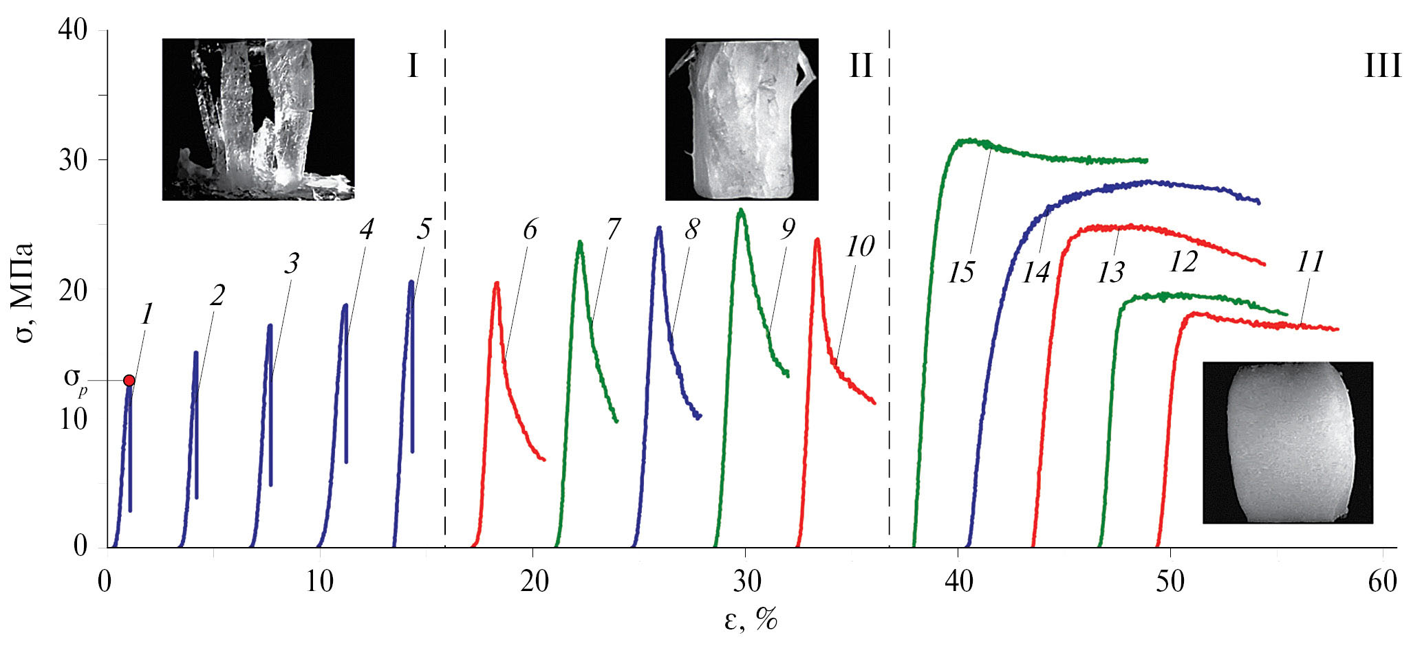 Во всех типах образцов первоначальный рост нагрузки вызывает линейный рост деформации. Чистый лед и ЛК с малым содержанием ПВС (примерно до 0.3 мас. %) демонстрируют такую зависимость σ–ε в процессе всего нагружения и квазихрупкое разрушение в конце процесса (серия кривых I). В материалах этой группы напряжения после достижения пикового значения σp резко падают скачком до нуля и образец разрушается на несколько крупных фрагментов (врезка на рис. 1 над первой серией кривых). При этом в ЛК с содержанием ПВС ω < 0.01 мас. % на диаграмме нагружения неупругая деформация не выявляется. При чувствительности канала регистрации деформации в MTS870 Landmark около 2 мкм, определяемой измеренным в нем уровнем шумов, и длине образца в направлении сжатия 20 мм предел обнаружения неупругой деформации находится на уровне e ≈ 10–2%. Следовательно, если неупругая деформация и есть в этих материалах перед разрушением, то она ниже указанной величины чувствительности испытательной машины. В ЛК с концентрацией ПВС ω > 0.01 мас. % и наличием НЧ перед достижением σp возникает неупругая деформация, регистрируемая машиной.