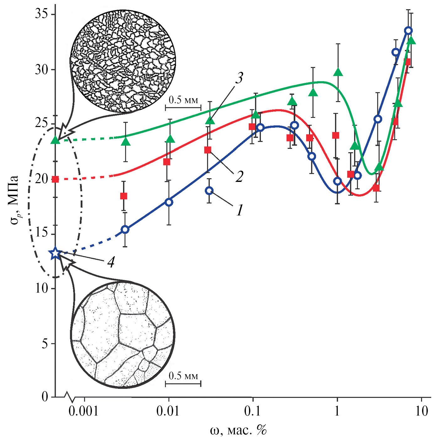 Рис. 2. Зависимости пиковых напряжений σp выдерживаемых ЛК при одноосном сжатии от концентрации ПВС ω: 1 – ЛК с ПВС, 2 – ЛК ПВС + 0.3% SiO2, 3 – ЛК ПВС + 3% SiO2, 4 – чистый лед. На врезках представлены зеренная структура чистого льда и ЛК с 3 мас. % SiO2.