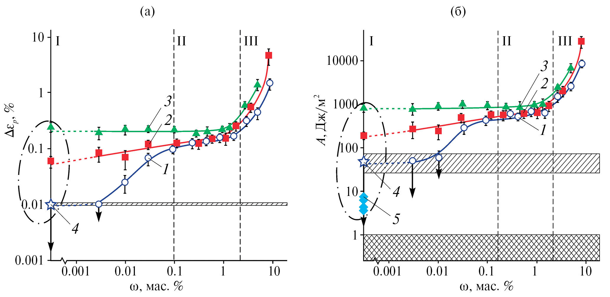 Рис. 3. Зависимости неупругой деформации Dep (а) и удельной работы A (б) от массовой доли добавки ПВС ω: 1 – ЛК с ПВС, 2 – ЛК ПВС + 0.3% SiO2, 3 – ЛК ПВС + 3% SiO2, 4 – чистый лед, 5 – чистый лед по данным [34]. Одинарная штриховка – пределы обнаружения Δεp ~ 0.01% и А ~ 50 Дж/м2, двойная штриховка – теоретический предел удельной энергии абсолютно хрупкого разрушения вблизи А ~ 1 Дж/м2, стрелки – возможные реальные значения Δεp и А.