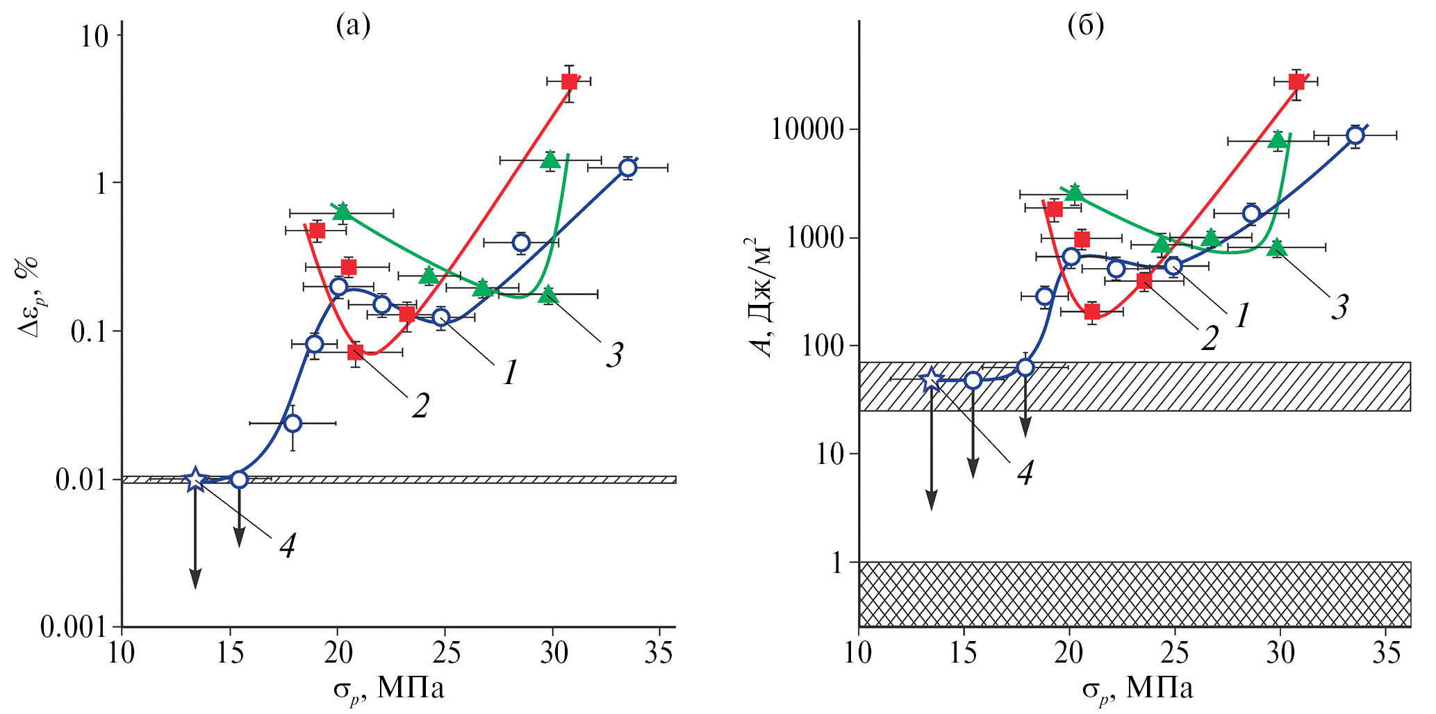Рис. 5. Зависимости неупругой деформации Dep (а) и удельной работы A (б) от sp для ЛК с ПВС: 1 – ЛК с ПВС, 2 – ЛК ПВС + 0.3% SiO2, 3 – ЛК ПВС + 3% SiO2, 4 – чистый лед. Одинарная штриховка – пределы обнаружения Δεp ~ 0.01% и А ~ 50 Дж/м2, двойная штриховка – теоретический предел удельной энергии абсолютно хрупкого разрушения вблизи А ~ 1 Дж/м2, стрелки – возможные реальные значения Δεp и А.