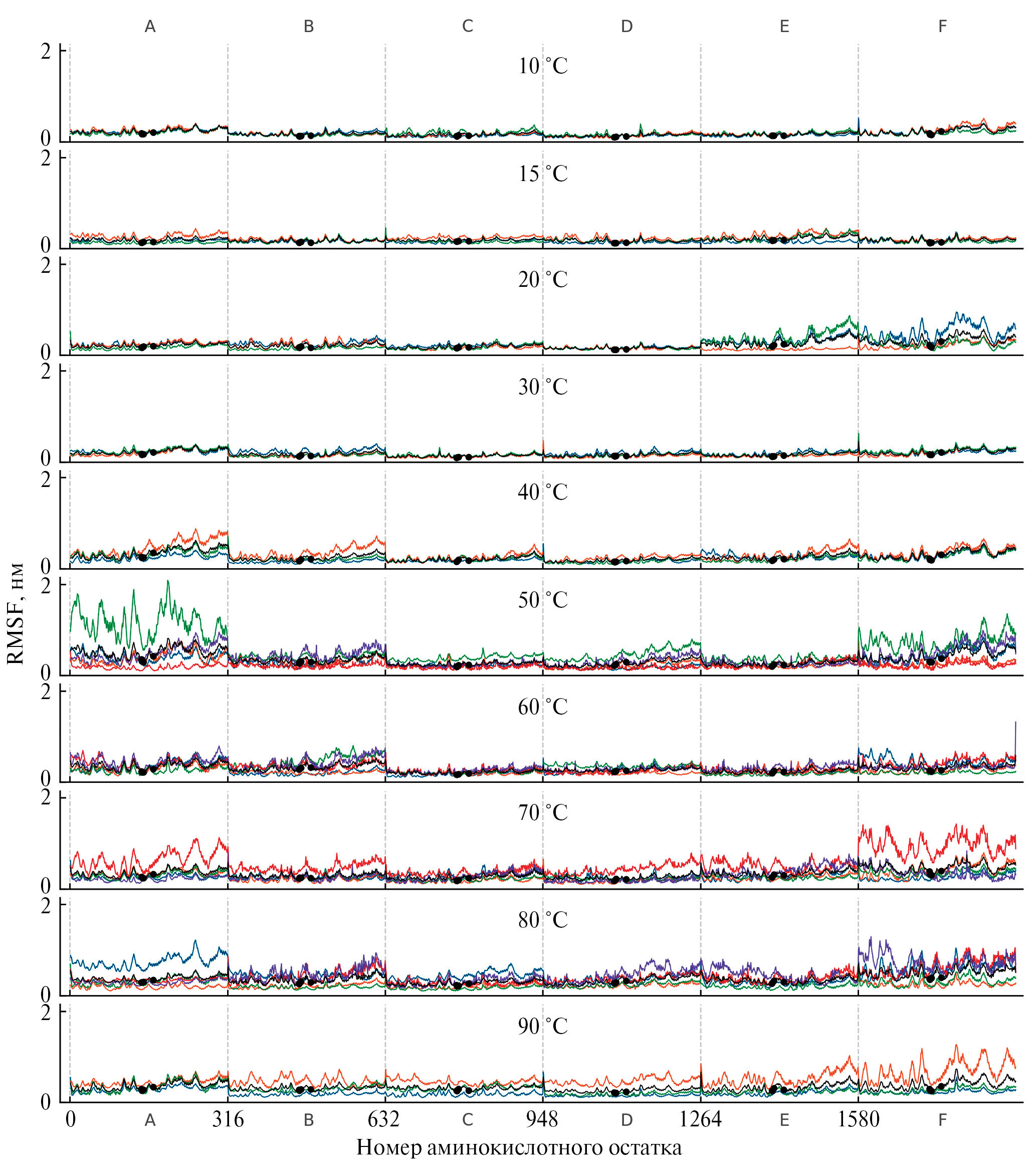 На рис. 1 цветными кривыми представлены графики RMSF атомов Cα для всех моделирований в одном масштабе, а черными кривыми – RMSF, усредненным по всем независимым моделированиям (трем для 10–40°C и 90°C; или пяти для 50–80°C) для каждой конкретной температуры. Из рис. 1 следует, что в среднем мономеры A и F наиболее нестабильны, а мономеры C и D, наоборот, самые устойчивые. Это объясняется тем, что, как видно из рис. 2, мономеры A и F имеют наименьшую площадь контактов с остальными мономерами, а мономеры C и D, наоборот, находятся “в глубине” гексамера.