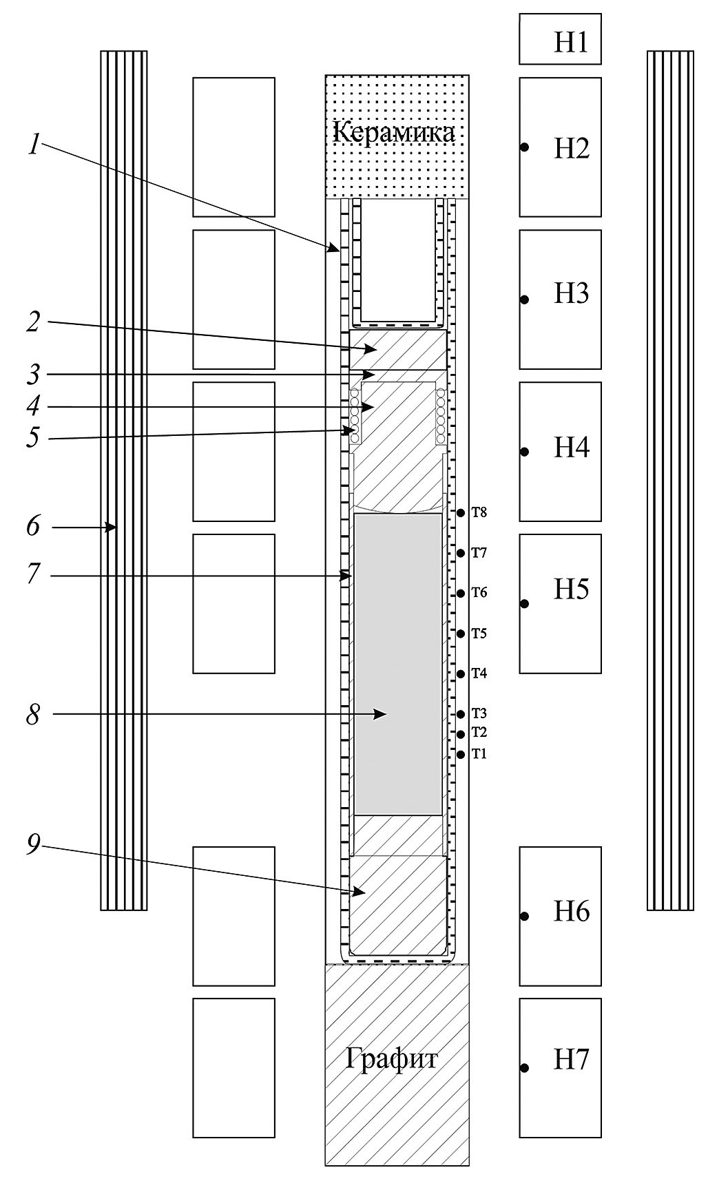 Рис. 1. Схема устройства ростовой ампулы с полупроводником и ее расположения в нагревательном блоке установки МЭП-01: 1 – кварцевая ампула, 2 – компенсирующая прокладка (графитовый войлок), 3 – крышка (графит), 4 – плунжер (графит), 5 – пружина (графит), 6 – магнитный индуктор, 7 – цилиндр (графит), 8 – перекристаллизуемый слиток, 9 – дно (графит), Т1–Т8 – измерительные термопары, Н1–Н7 – нагреватели.