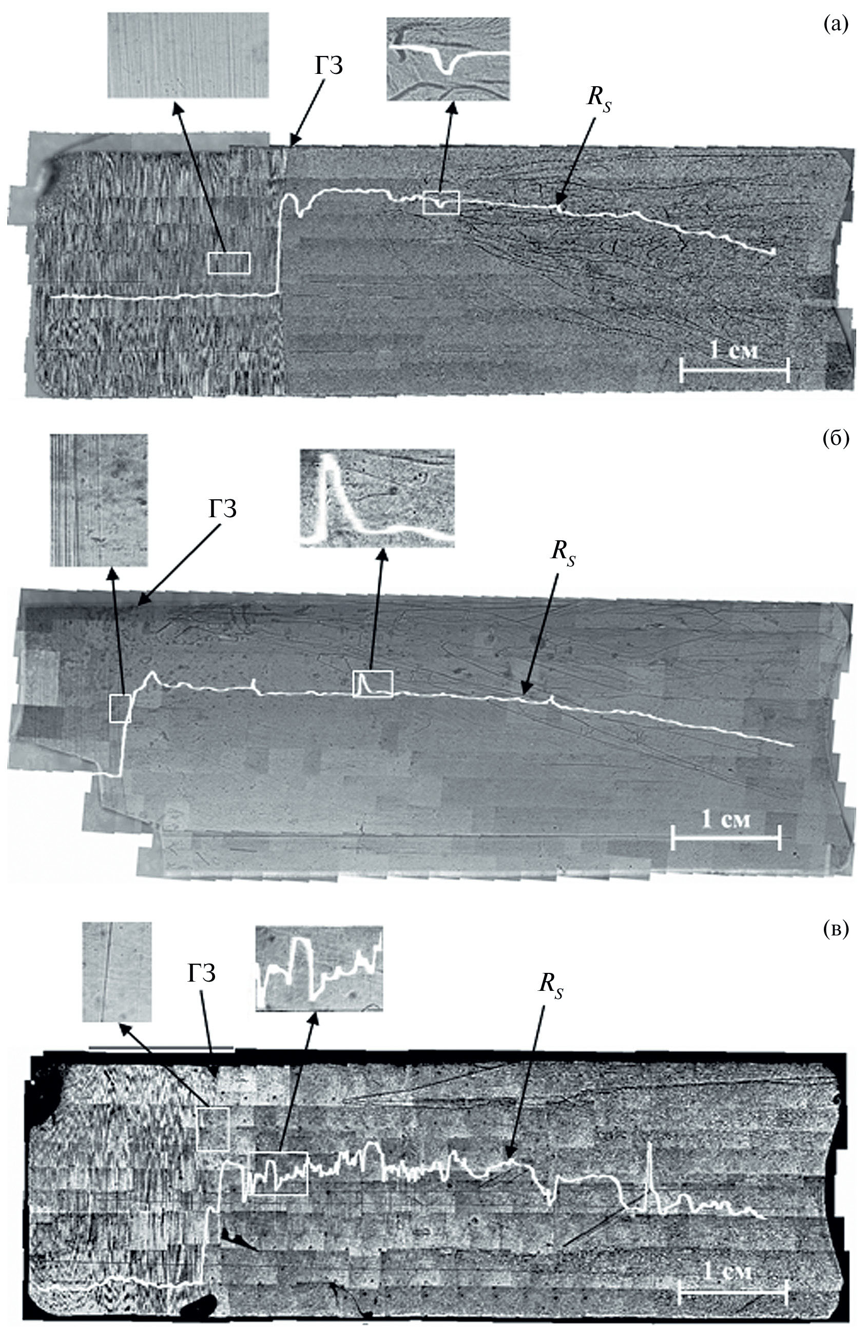 Рис. 2. Особенности распределения концентрационной неоднородности в кристаллах Ge(Ga) (ГЗ – граница затравливания, RS – сопротивление растекания): образцы 1 (а), 2 (б), 3 (в).