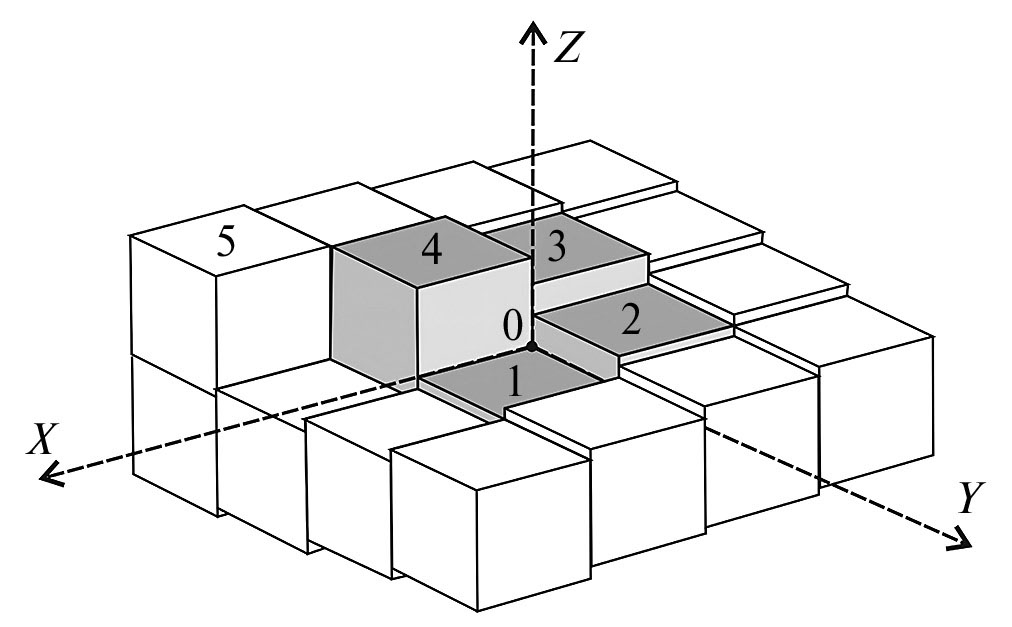 Равновесное расстояние между частицами при парном взаимодействии в случае (3) хорошо известно: Однако с помощью расчетов легко установить, что для протяженного кубического кристалла минимум энергии взаимодействия частицы достигается на меньшем расстоянии rmin = 1.085c от ближайшего соседа. Расстояния в кристалле удобно рассчитывать в величинах r/rmin. Для поверхностной частицы, представляющей основной интерес в данной задаче, в первую координационную полусферу входит 17 соседей, а во вторую – 57.