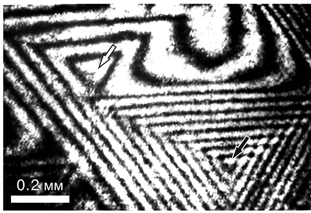 Рис. 2. Интерферограмма полигональных пирамид роста двух винтовых дислокаций на поверхности грани (111) алюмо-калиевых квасцов. Пространственная частота интерференционных полос пропорциональна частоте элементарных ступеней. Нижняя дислокация (черная стрелка) обладает вдвое большим вектором Бюргерса, и ее пирамида роста активно поглощает верхнюю пирамиду (белая стрелка). Угол между базовой поверхностью грани октаэдра алюмо-калиевых квасцов и наклонной плоской гранью растущей пирамиды, представляющей собой простую кристаллографическую форму тетрагонтриоктаэдра, меняется обычно в диапазоне от 10 до 20 угловых минут [14].