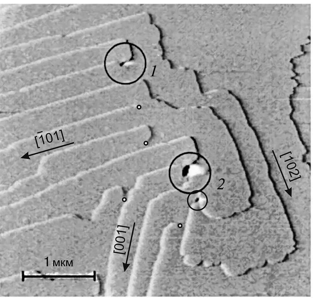 Обсудим изображение рельефа поверхности грани (010) кристалла бифталата калия, извлеченного из пересыщенного раствора, приведенное в [3] (рис. 3). Только у трех дислокаций: одной с вектором Бюргерса 3b, образующей трехходовую спираль, обозначенной цифрой 2, и двух с вектором 2b (нижняя выделена малым кружком), наблюдаются полые ядра. Остальные четыре дислокации с единичным вектором b, оказавшиеся в пределах кадра, не имеют полых ядер. Семь обнаруживаемых дислокаций имеют один знак. Все полигональные элементарные ступени, в среднем равномерно удаленные друг от друга и ориентированные по преимущественным, согласно [24], направлениям <001>, <101> и <102>, на поворотах демонстрируют закругление со средним значением радиуса 100 нм и стандартным отклонением 20 нм. Выполнено 21 измерение радиуса закругления полигональной ступени на приведенном на рис. 3 изображении. Согласно температуре плавления бифталата калия (573 K) энергия связи E условных строительных частиц в кристалле составляет ~10–20 Дж (0.05 эВ). Учитывая размеры двумерных зародышей на изломах полигональных ступеней, с помощью формулы (12) можно сделать вывод, что последняя стадия роста грани перед извлечением кристалла из раствора и выполнением съемки поверхности (рис. 3) происходила при относительном пересыщении sf = 0.012. Поскольку одноходовые дислокации при разрешении данного снимка, составляющем ~20 нм, не демонстрируют полых ядер (rʹ < 20 нм), то из формулы (9) и закона определяющего термодинамический предел существования макропеременной для конденсированного вещества (радиуса ядра) [25], следует, что предельное недосыщение sʹ0 для строительных частиц на элементарной ступени вблизи дислокации по модулю не превышает 0.012. Таким образом, для дислокаций с единичным вектором Бюргерса критерий (11) при выращивании данного кристалла был преодолен, чего нельзя сказать о двух- и трехходовых дислокациях, расположенных в пределах кадра.