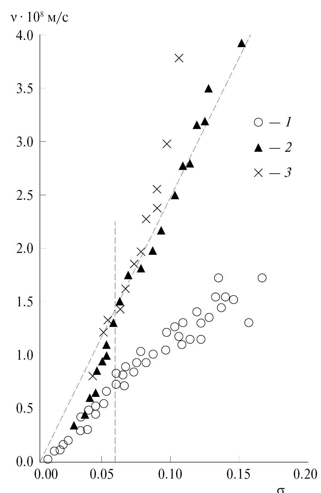 В рамках этой гипотезы (15) обсудим эмпирические данные (рис. 4). На начальном этапе зависимость скорости нормального роста грани от общего пересыщения раствора напоминает квадратичную (14), но с некоторого пересыщения (σ > 0.06) она явно становится линейной (рис. 4, направление для гексаэдра квасцов выделено пунктиром).