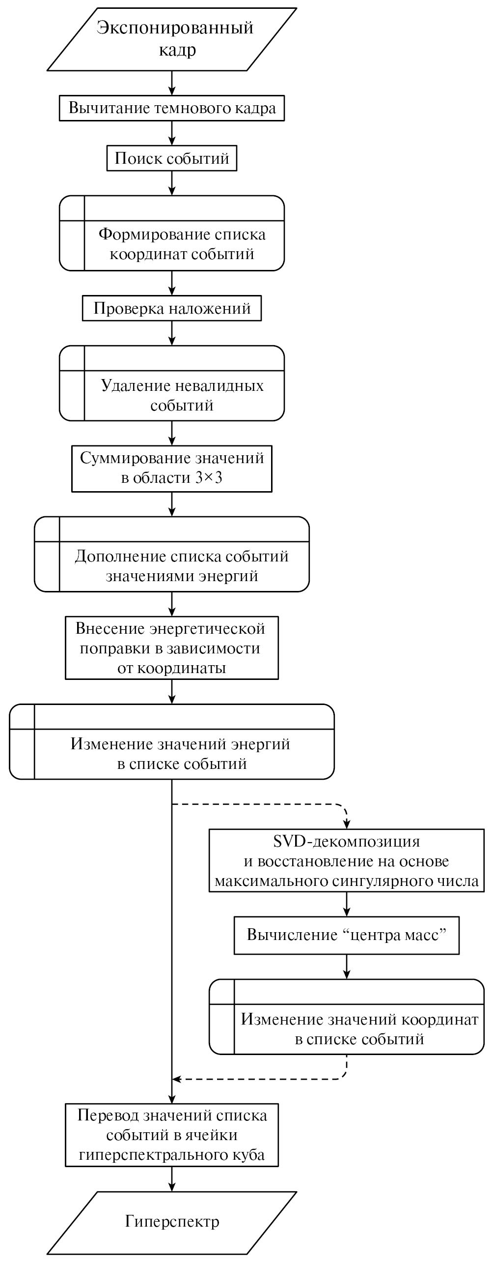 В такой идеологии [21–23] процесс измерения представляет собой циклическую процедуру быстрого измерения картины поглощения единичных фотонов, считывания и постобработки. Обработка сигналов матричного детектора происходит в режиме реального времени и не должна превышать экспозицию, что накладывает ряд ограничений на применяемые подходы и методы в части скорости и эффективности работы. Работа с реальной ПЗС-матрицей требует учета совокупности факторов для получения требуемого энергетического разрешения, высокого быстродействия, уменьшения артефактов, таких как неэффективность переноса заряда по матрице, шумы считывания, плотность потока фотонов.