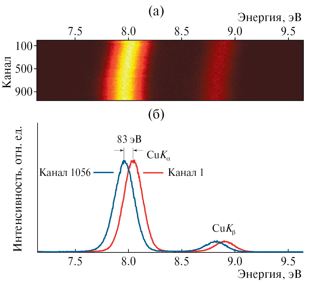 Коррекция энергии. В приборах с зарядовой связью наблюдается эффект искажения энергии фотона, зависящий от позиции поглощения на фоточувствительной матрице. В процессе перекачки зарядов через матрицу и регистр считывания теряется часть заряда [37], размер потерь зависит от числа и скорости переносов. Частота переноса заряда в параллельном регистре на несколько порядков ниже частоты в последовательном, и потери при параллельном переносе в несколько раз меньше, чем при последовательном, и потерями в нем можно пренебречь [38]. В используемой ПЗС-камере эффективность переноса заряда в параллельном регистре близка к единице, и потери составляют менее одного электрона из 1000 на весь регистр. Последовательный регистр обладает худшей эффективностью переноса заряда, а потери составляют приблизительно 10 электронов из 1000 для дальней ячейки регистра, что эквивалентно 36 эВ. Чтобы продемонстрировать этот эффект, было проведено калибровочное измерение флуоресцентного спектра излучения медной мишени. На рис. 3а изображена зависимость энергетического положения Kα- и Kβ-линий меди от номера ячейки в последовательном регистре. В дальних регистрах смещение значений энергии фотонов для линии меди достигает 83 эВ, что приводит к ухудшению интегральной разрешающей способности (рис. 3б).