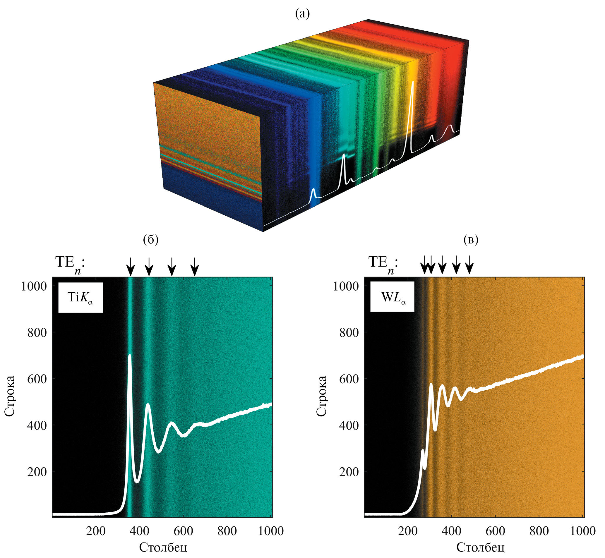 Итоговый спектр флуоресцентного излучения структуры W(3 нм)/Ti(16 нм)/W(3 нм), полученный интегрированием сигнала по всем пикселям детектора, представлен на рис. 6. Полный набор экспериментальных данных представляет собой гиперспектральное изображение – трехмерный массив данных, включающий в себя спектральную информацию для каждого пикселя ПЗС, и отражает информацию о пространственно-энергетической структуре флуоресцентного излучения, выходящего под скользящими углами из слоистой структуры (рис. 7а).