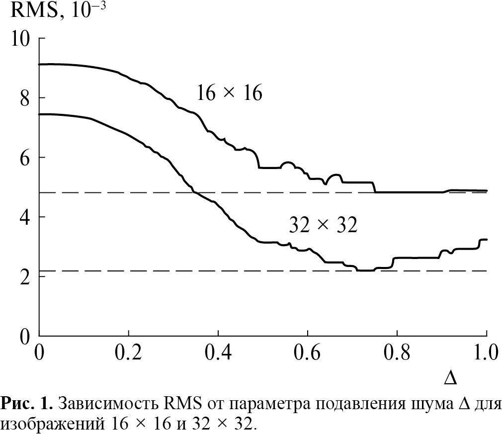 На рис. 1, 2 представлены результаты вычислительного эксперимента. Число уровней декомпозиции L для изображений размером 32 × 32 и 16 × 16 равно 9 и 7. Найденные графически минимальные значения RMS составляют 0.00221 и 0.00482 при Ä = 0.75 и Ä = 0.8 для изображений размером 32 × 32 и 16 × 16 соответственно (табл. 1 и 2). Фильтрованные изображения размером 32 × 32 и 16 × 16 содержат приблизительно 2 и 4% ненулевых коэффициентов преобразования от их общего числа. Определение Ä по минимальному значению RMS позволяет после фильтрации сохранить только такие значимые коэффициенты преобразования зашумленного сигнала, которые совпадают с соответствующими коэффициентами эталонного сигнала и вместе с этим превышают средний уровень шума.