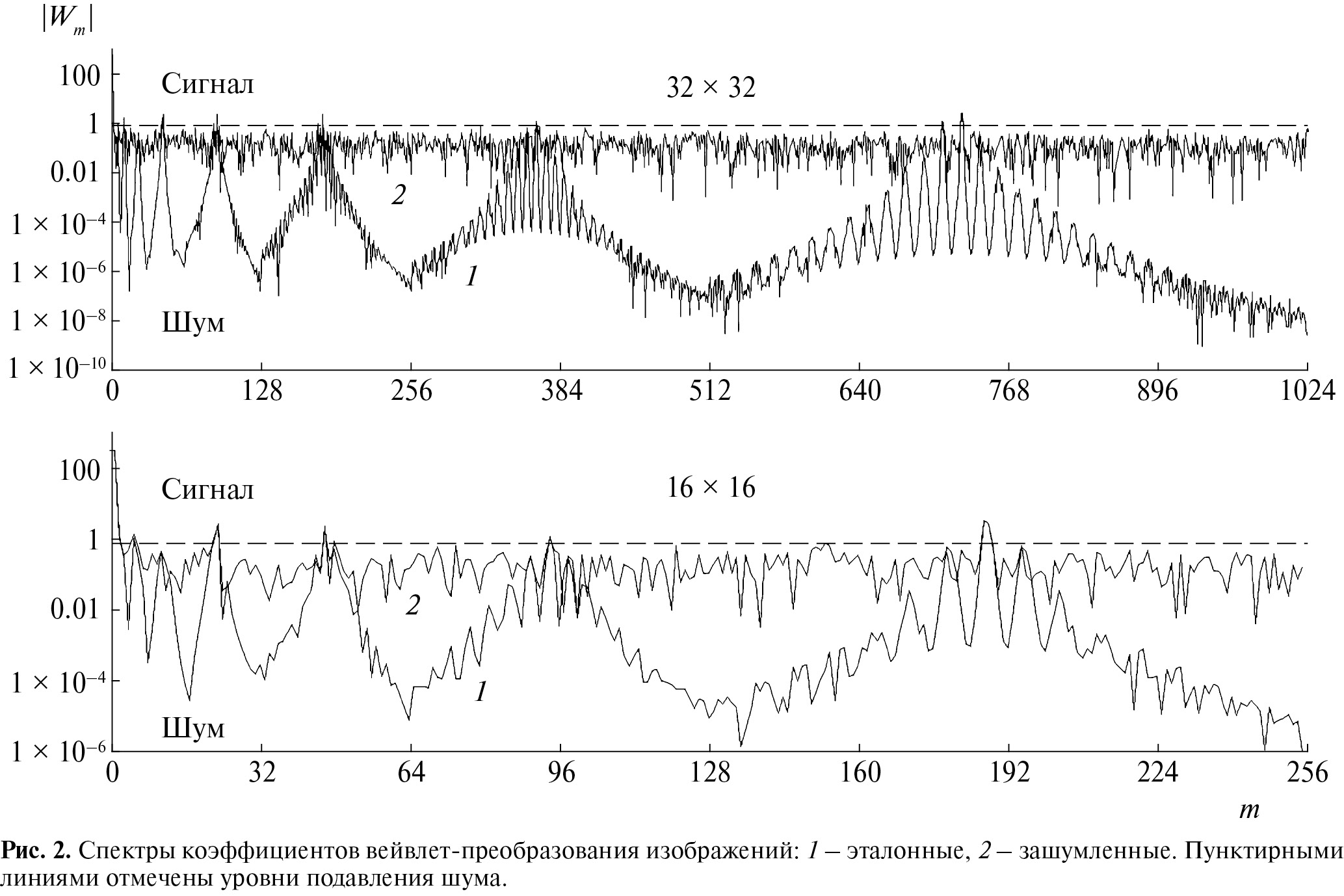 Рис. 2. Спектры коэффициентов вейвлет-преобразования изображений: 1 – эталонные, 2 – зашумленные. Пунктирными линиями отмечены уровни подавления шума.