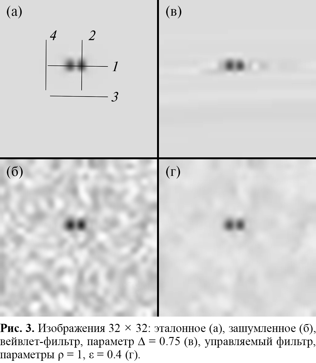 Сравнение результатов фильтрации показывает, что управляемый фильтр равномерно уменьшает шум на всей площади изображения, в то время как одномерное вейвлет-преобразование эффективно удаляет следы шума, но оставляет артефакты (“слабые тени”), вытянутые вдоль горизонтального направления. По-видимому, причиной этого явления является применение одномерного вейвлет-преобразования (10) к 2D-изображению, вытянутому в одну строку длиной 32 × 32 пикселей.