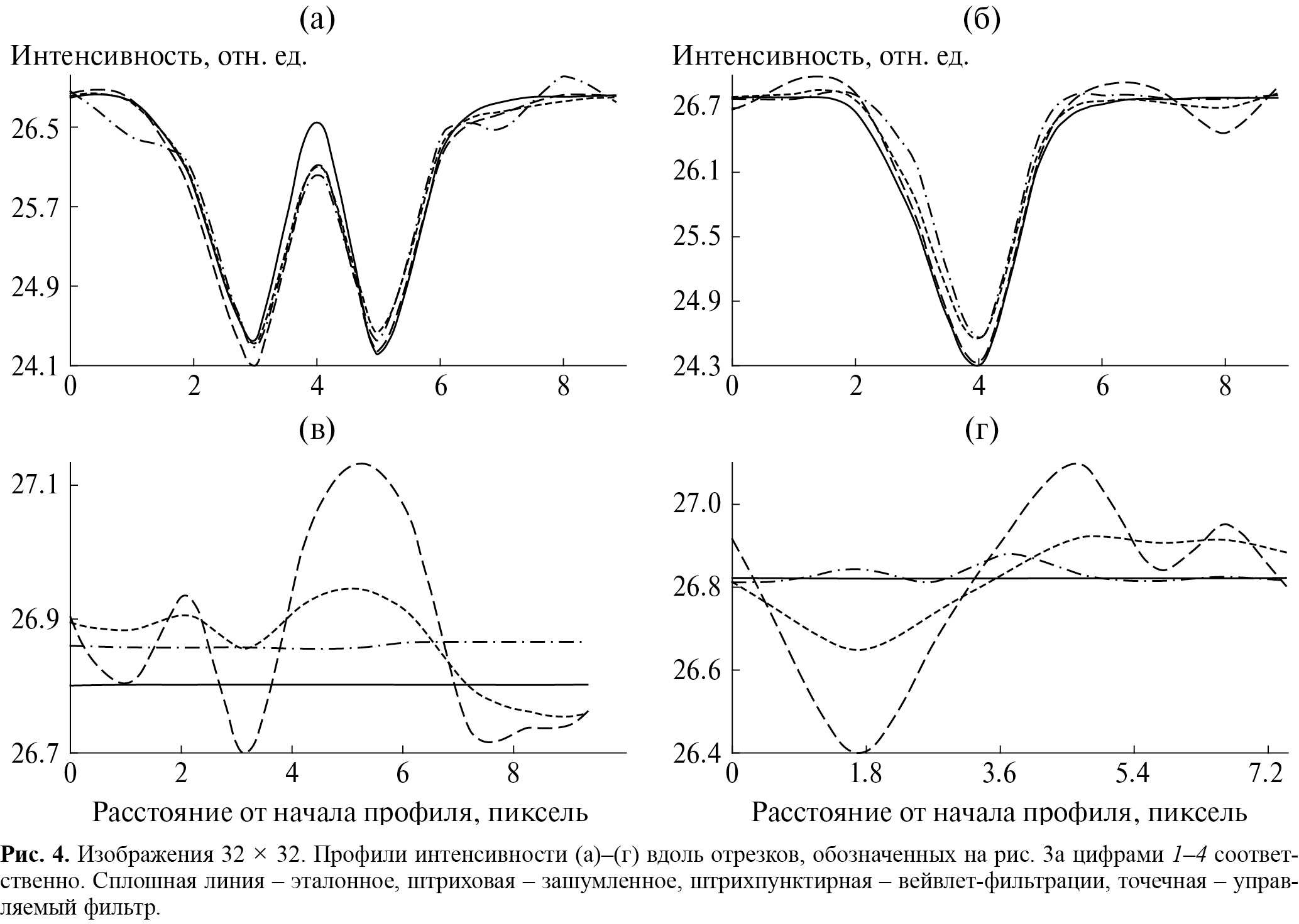 Интересно, что похожее поведение демонстрируют профили изображения, полученные в результате применения управляемого фильтра, показанные на рис. 4г. Они построены вдоль вертикального отрезка, обозначенного цифрой 3 на рис. 3а. Отметим, что “вертикальные” профили интенсивности изображения, полученные в результате применения вейвлет-преобразования, показывают поведение, отличное от соответствующих профилей эталонного или зашумленного изображений. Как отмечалось выше, такое поведение (артефакт) обусловлено применением одномерного вейвлет-преобразования. Согласно [26, с. 111] подобные артефакты можно устранить, применяя вейвлет-преобразование последовательно к строкам и столбцам изображения.