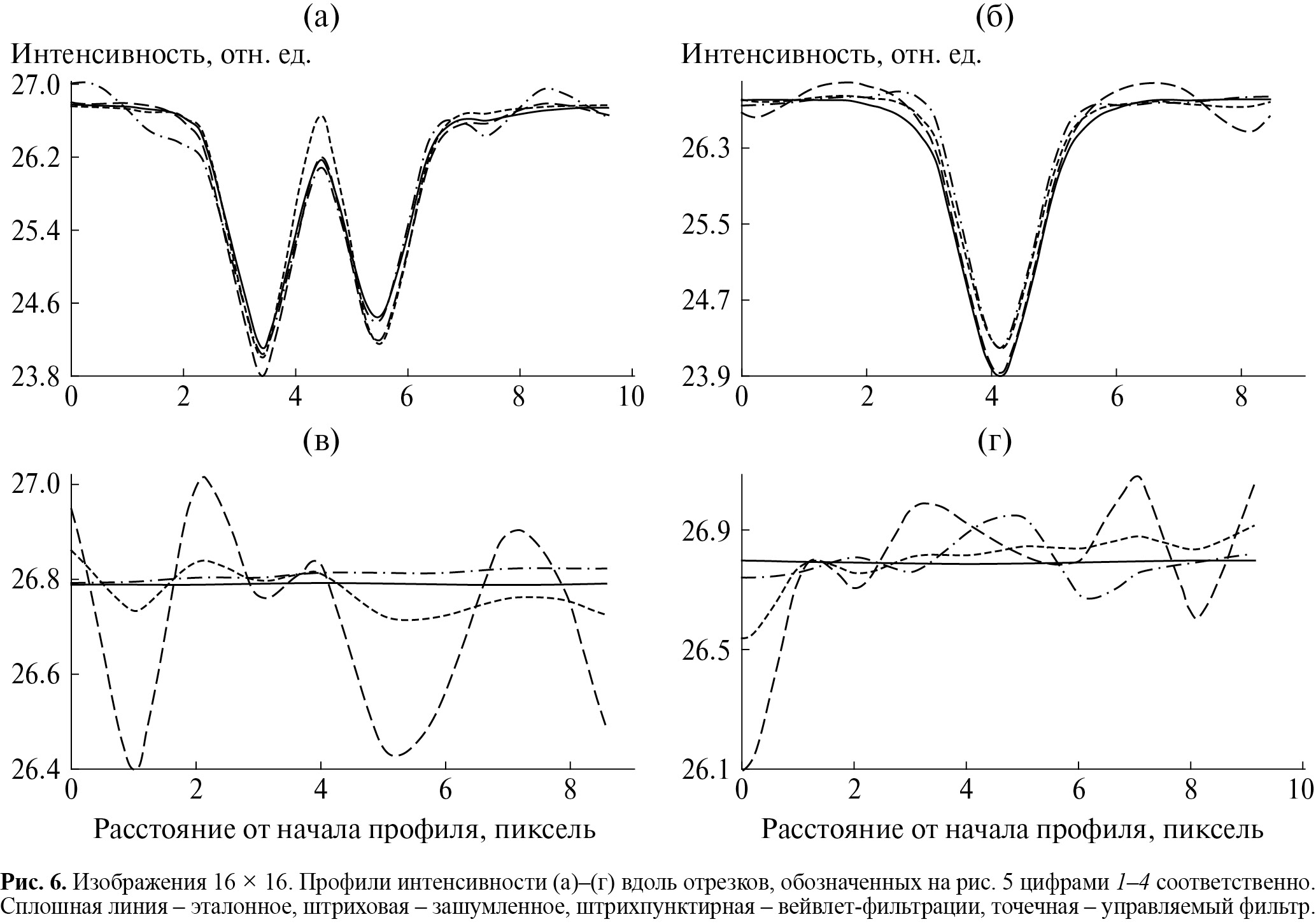 Рис. 6. Изображения 16 × 16. Профили интенсивности (а)–(г) вдоль отрезков, обозначенных на рис. 5 цифрами 1–4 соответственно. Сплошная линия – эталонное, штриховая – зашумленное, штрихпунктирная – вейвлет-фильтрации, точечная – управляемый фильтр.