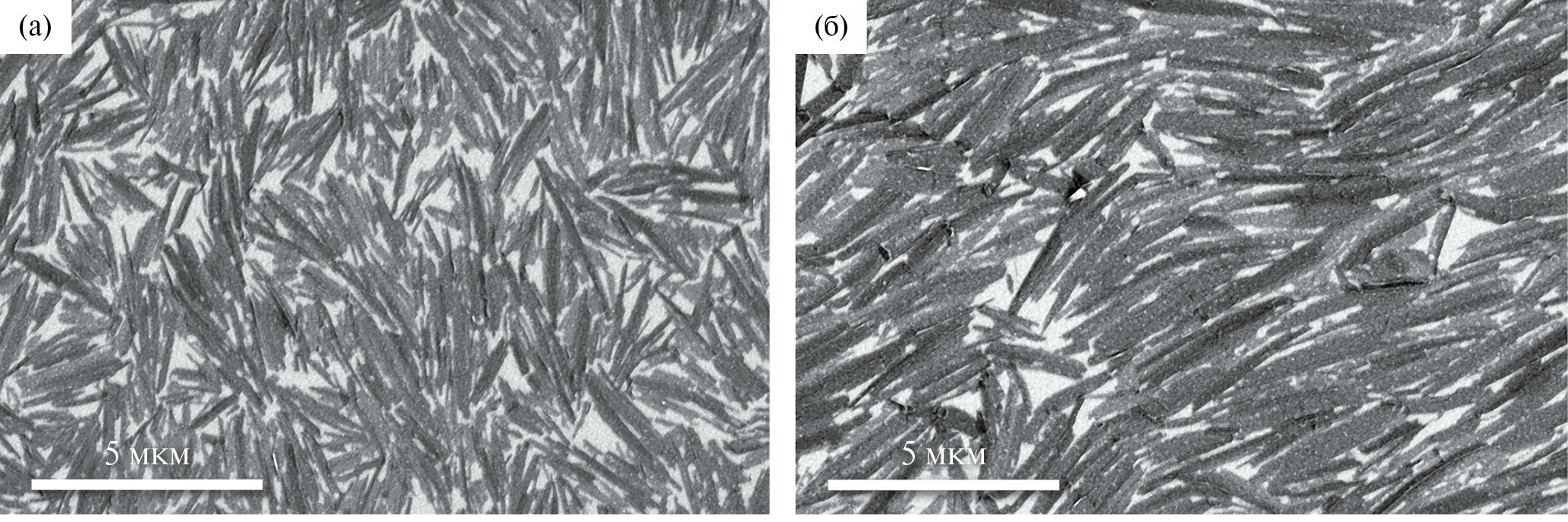 На рис. 4 представлены изображения поверхности монослоя диина n3-3 до (а) и после (б) УФ-облучения образца. Пленка диина продемонстрировала четко выраженную доменную структуру в виде полосок, достигавших 3 мкм в длину и 0.4 мкм в ширину (рис. 4а). Такая доменная структура монослоя явилась следствием горизонтального положения молекул диина на поверхности водной субфазы. Форма доменов в виде полосок была обусловлена значительными размерами молекул диина и сильными водородными связями молекул внутри доменов. На рис. 4б показана поверхность пленки диина n3-3 после УФ-облучения в течение 20 мин. В результате фотополимеризации произошло увеличение размеров доменов и появилась преимущественная ориентация для большей части доменов в пленке. Структура пленки уплотнилась. Сравнение изображений поверхности пленки на рис. 4а и 4б позволяет прийти к заключению о том, что в течение первых 15–20 мин УФ-облучения домены объединялись в более крупные образования. Одновременно внутри доменов активно шла реакция ТТП-полимеризации (рис. 3а, кривая 1). Происходило быстрое образование областей ПДА голубой фазы с длиной сопряжения полимерных цепей, не достигавшей значительных размеров (рис. 3б, кривая 1).