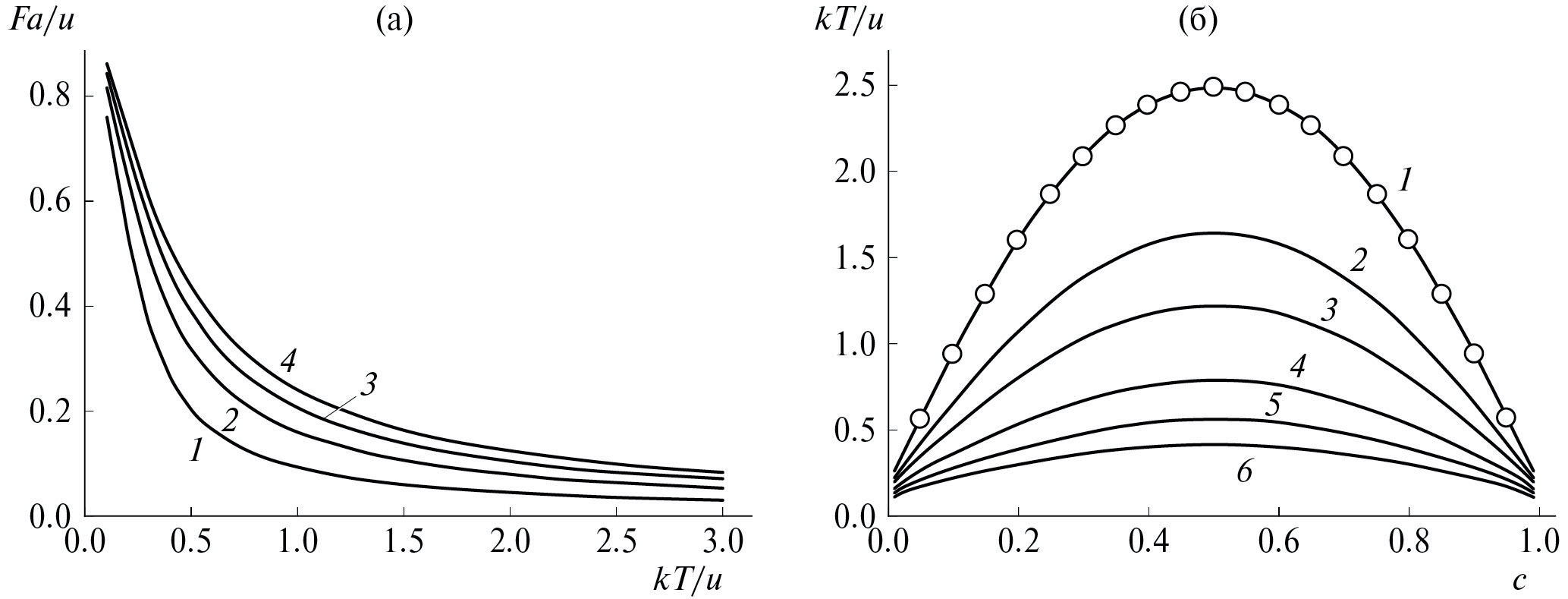 Рис. 2. Пороговое напряжение (а) в зависимости от температуры Tu = kT/u при различных концентрациях атомов раствора c: 0.1 (1), 0.2 (2), 0.3 (3), 0.4 (4). Пороговая температура (б) в зависимости от концентрации атомов раствора при различных значениях безразмерной движущей силы Fa/u: 0.1 (1), 0.15 (2), 0.2 (3), 0.3 (4), 0.4 (5), 0.5 (6). Расчет с помощью соотношения (4) (сплошные линии) и альтернативный расчет (кружки), приводящий к условию δ = 1, как и зависимость порогового напряжения от концентрации атомов раствора.