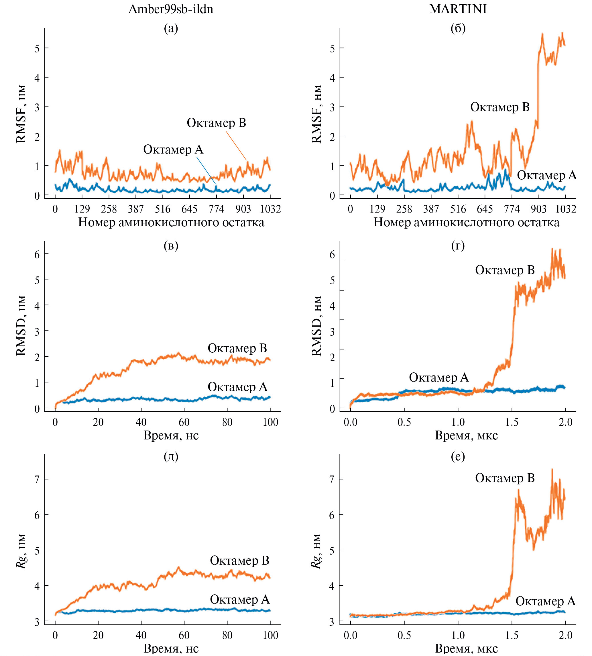Для оценки гибкости полипептидной цепи использовали график RMSF (рис. 3а, 3б) атомов Cα, который показывает степень отклонения каждого атома Cα от его среднего положения за все время моделирования. Большие значения RMSF и их широкий диапазон указывают на нестабильность белка. График RMSD (рис. 3в, 3г) демонстрирует усредненные отклонения атомов от их первоначального положения. В качестве показателя компактности октамера использовали радиус гирации Rg (рис. 3д, 3е).