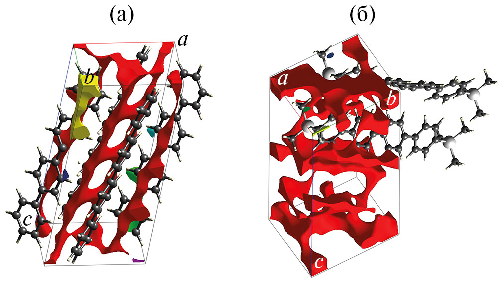 Рис. 12. Визуализация пустот в элементарных ячейках кристаллов 4P (а) и TMS-4P-TMS (б) при 20°С (изоповерхность 0.002 э∙Å–3).