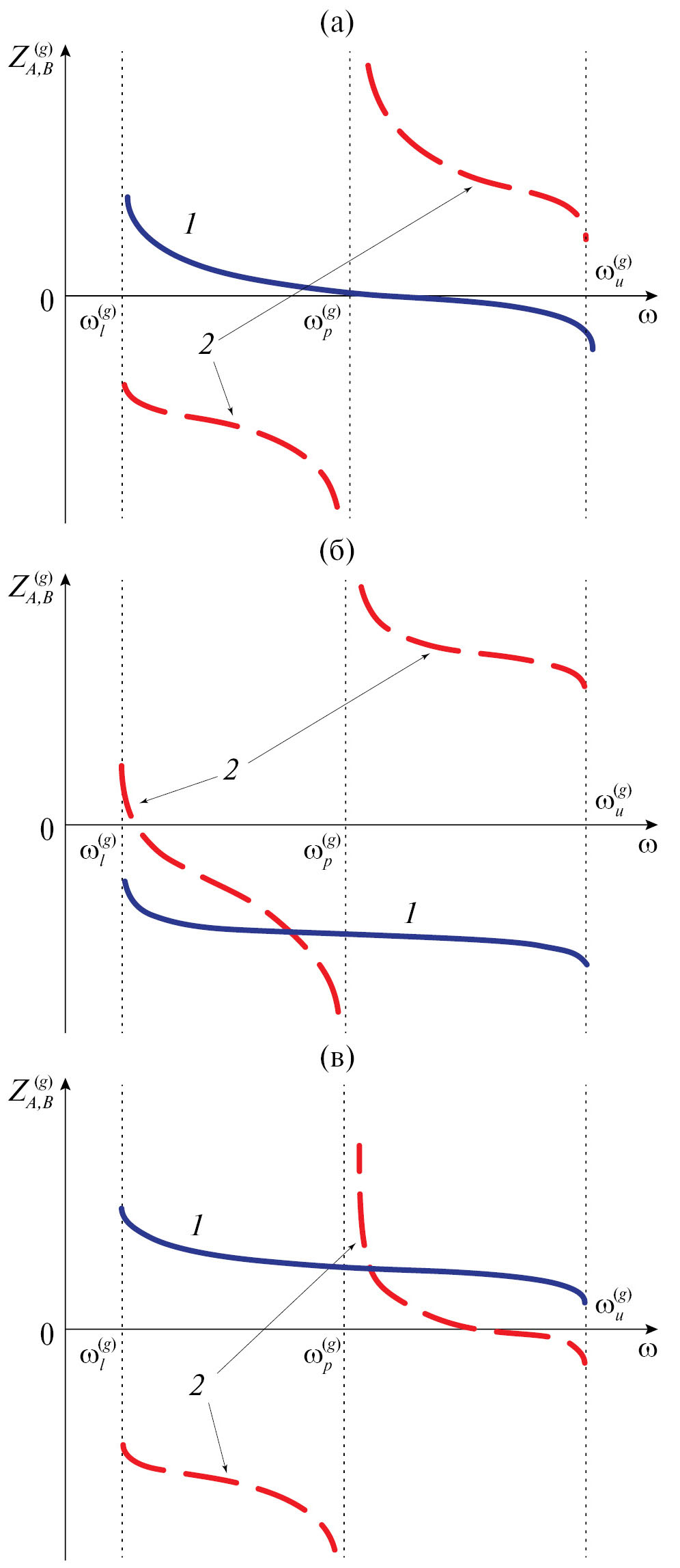 Записав условия (2) на границах пленка–полубесконечная среда через импедансы полубесконечных сред и пленки, можно представить дисперсионные уравнения для ППП в виде равенств нулю определителей действительных симметричных матриц . В результате анализ существования решений дисперсионных уравнений сводится к анализу обращения в ноль собственных значений матриц . Используя установленные в данной части работы свойства этих собственных значений, а также принимая во внимание возможные частотные зависимости импедансов полубесконечных СР (рис. 2–4) и полубесконечной однородной среды, в части II работы будут найдены допустимые числа ТЕ-ППП и ТМ-ППП в пленке металла в зависимости от типа запрещенной зоны при различном окружении пленки.