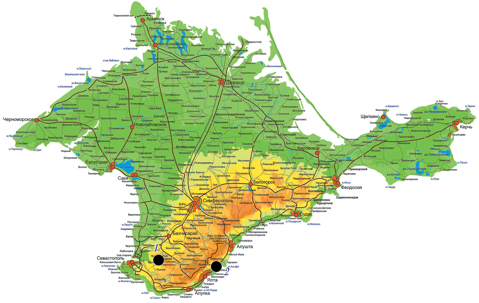 Рис. 1. Карта Крыма с указанием местоположения памятников, из которых происходят образцы известковых растворов: 1 – плато Эски-Кермен, 2 – Горзувиты (современный Гурзуф).