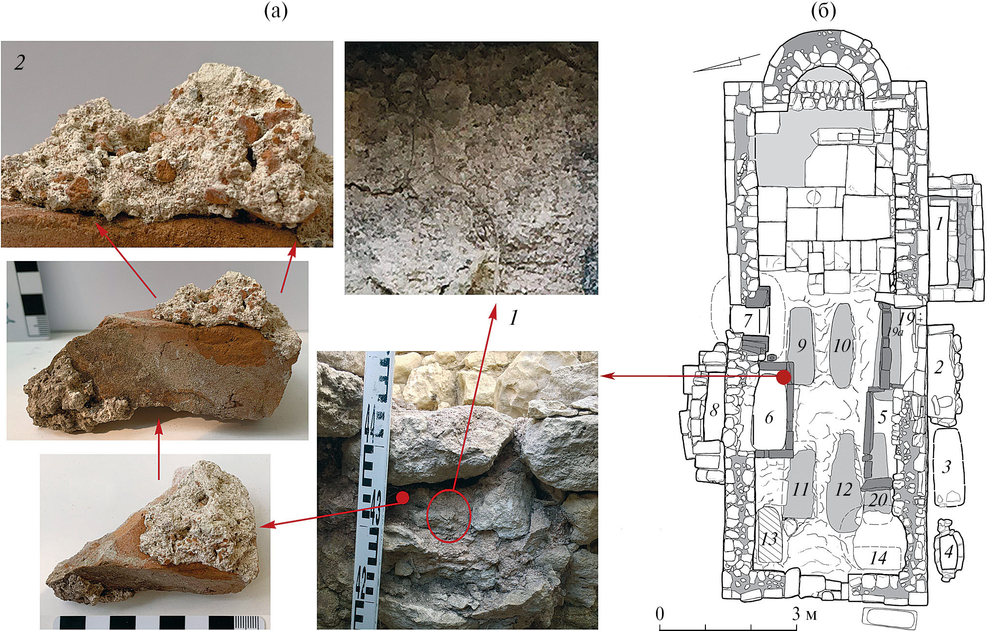 Объект 1: прямоугольная в плане гробница 6/2019 на плато Эски-Кермен пристроена к внутренней стороне северной стены притвора однонефного храма X–XIII вв. в квартале 2 (рис. 2б). Гробница 6/2019 использовалась в XII–XIII вв. [1]. Ее возвели после того, как высеченные в скальном полу притвора могилы были полностью заполнены и перекрыты глиняным полом. Во время вырубки нижней части гробницы была разрушена тонкая скальная перемычка, отделявшая ее от могилы 9/2019. Образовавшееся в результате отверстие строители заложили небольшими камнями и черепицей на известковом растворе с обильными включениями битой керамики. В качестве образцов для исследования взяты раствор из этой перемычки, возведенной в начале XII в. между могилой и гробницей (ЭК1; рис. 2, 1), и фрагмент черепицы, вывалившийся из кладки, с прилипшим комом раствора розоватого цвета с обильными включениями толченной керамики (ЭК2; рис. 2, 2).