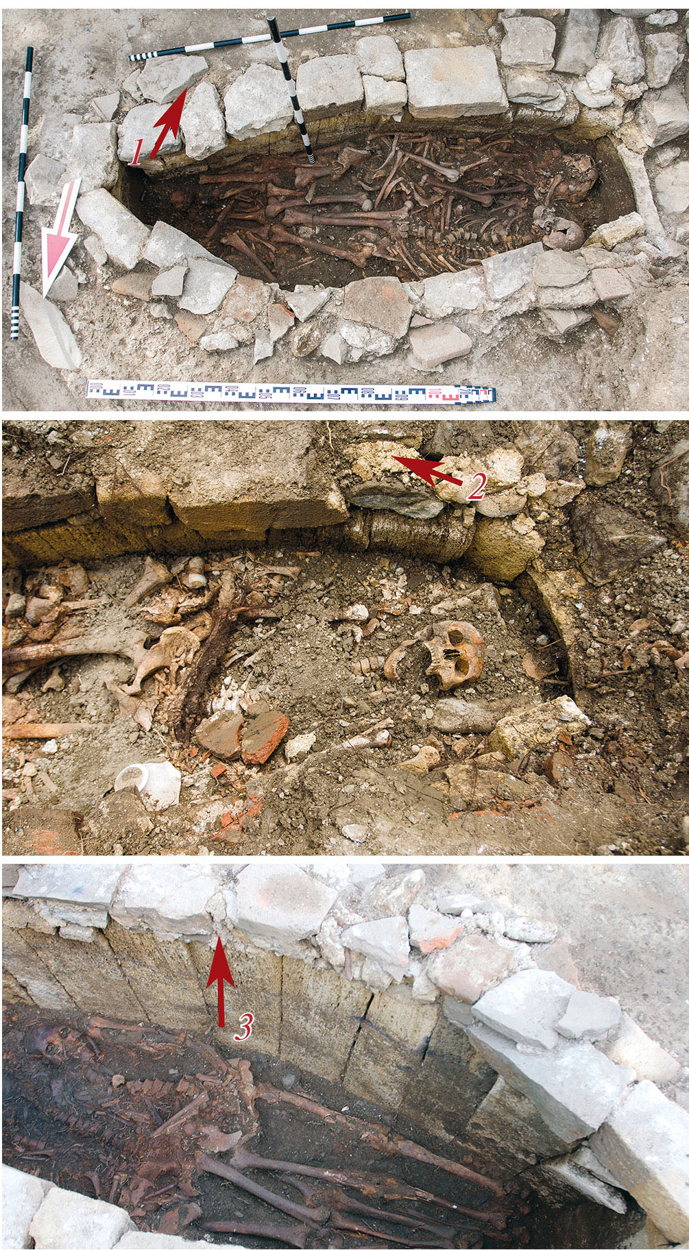 Объект 2: гробница, обнаруженная внутри небольшого одноапсидного храма в Горзувитах (рис. 1, 2). Гробница расположена под полом церкви, которая перекрывается более поздним храмом, датирующимся не ранее второй половины XIII в. [7, с. 413, 415–421, рис. 3–5]. Сопоставление данных археологии, радиоуглеродного датирования и изотопных исследований позволяет предположить, что первые захоронения в гробнице нижнего храма были совершены не ранее XI в., тогда как дата погребения последнего умершего относится к середине–третьей четверти XIII в. [8, 9]. Гробница ладьевидной формы перекрыта четырьмя крупными плитами, опиравшимися на обкладку, выложенную по контуру погребального сооружения и состоявшую из камней, блоков ракушечника, нескольких фрагментов черепицы и плинфы; местами прослеживался известковый раствор [10, с. 188]. Представленные в работе образцы взяты из верхней части обкладки могилы (Г46.3), ее южного (Г46.4; Г46.7; рис. 3, 1, 2) и северного бортов (Г46.8; рис. 3, 3). Обкладка сооружена не ранее середины XIII в., в поздний период использования погребального сооружения, когда оно уже было практически заполнено и появилась необходимость в дополнительном пространстве.