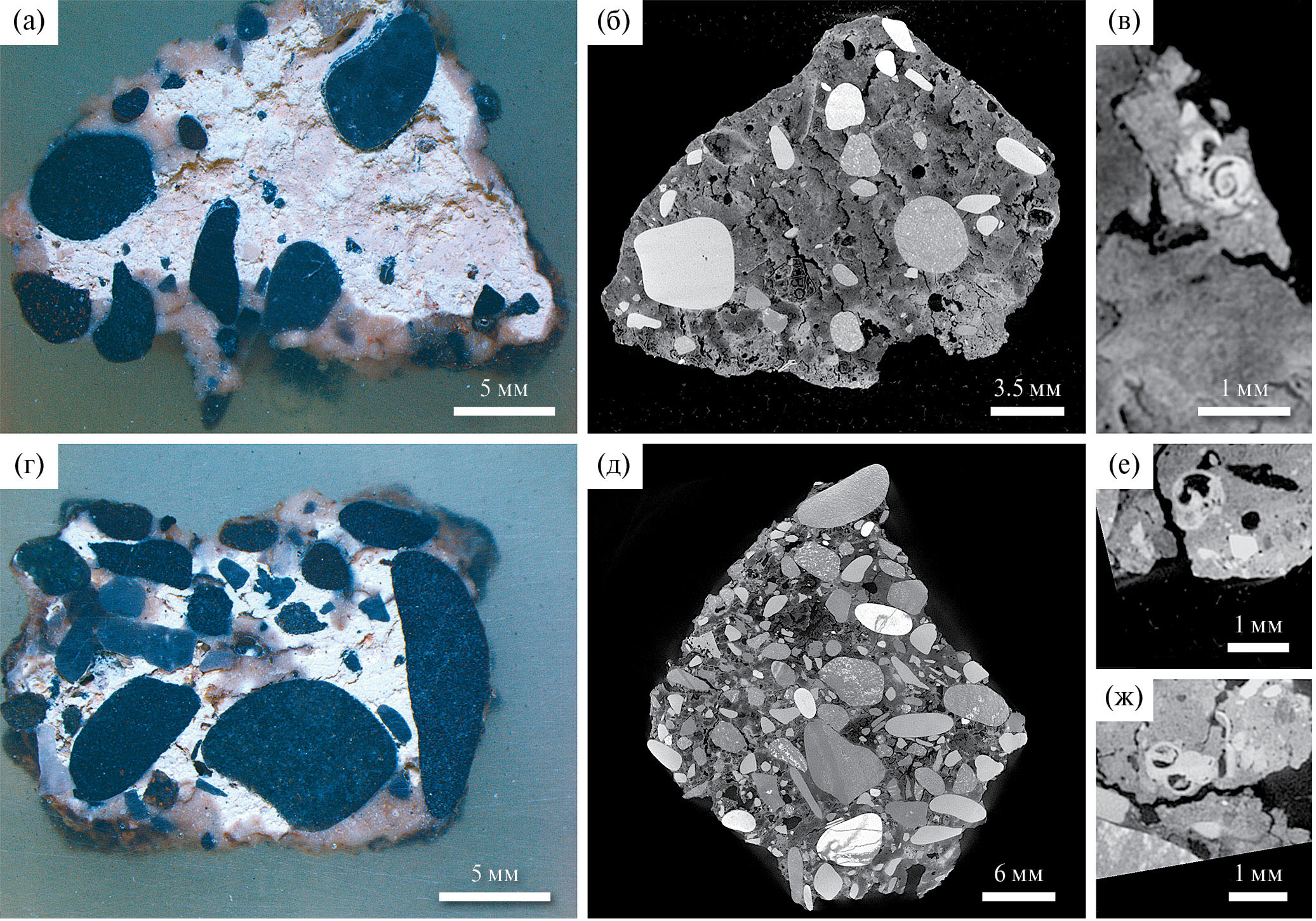 Включения органического происхождения присутствуют во всех образцах. В образцах Г46.4 (рис. 5в) и Г46.7 (рис. 5е, 5ж) наблюдаются единичные органические включения (раковины) размерами до 2 мм. В Г46.3 органические включения представляют собой полые трубочки (и их фрагменты) сечением ~1 × 2 мм с толщиной стенки ~300 мкм, вероятно, растительного происхождения (рис. 6д). В образце Г46.8 наблюдаются оба вида органических включений (раковины до 1.5 мм длиной и фрагменты трубочек). Целые раковины практически отсутствуют, сохранившиеся фрагменты распределены по объему в виде конгломератов (рис. 6б, 6в).