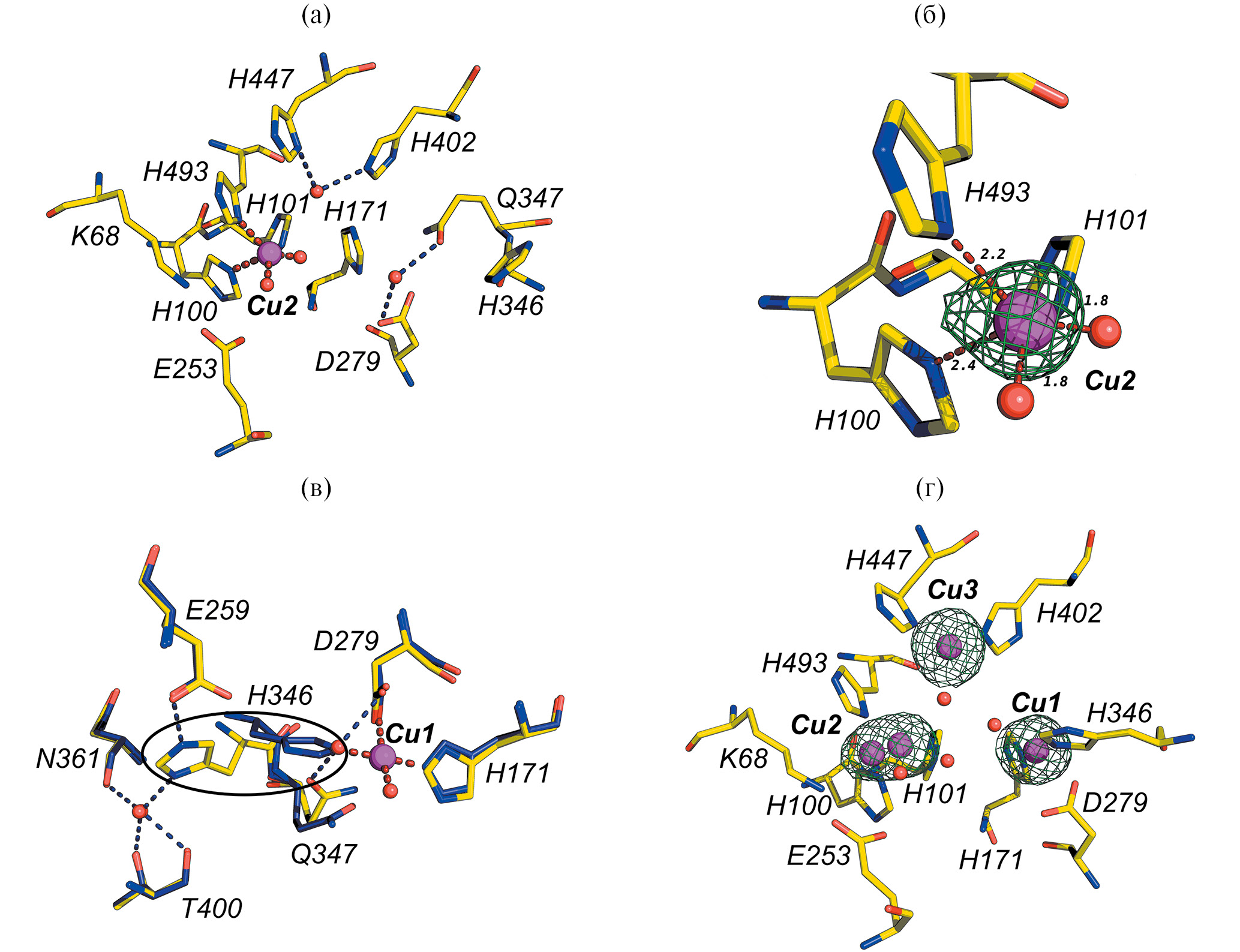 Рис. 2. Активный центр апоформы pmTcDH (PDB ID: 8Z75) (а) до настаивания кристаллов ионами меди. Максимум на разностной карте электронной плотности на уровне 3σ описан ионом меди Cu2 с заселенностью 0.2, соответствующие координационные расстояния указаны в Å (б). Совмещение структур апоформы (PDB ID: 8Z75) и холоформы (PDB ID: 8Q9X) показало (в), что в отсутствие иона Cu1 остаток Н346 меняет свое положение и образует водородные связи с остатком Е259 и молекулой воды. Восстановление трехъядерного медного центра pmTcDHCu2+ после настаивания кристаллов ионами меди (2+) (PDB ID: 8Z76): показаны максимумы на разностной карте электронной плотности на уровне 3σ в положениях ионов Cu1, Cu2, Cu3 (г). Ионы меди и молекулы воды – большие и маленькие сферы соответственно, координационные и водородные связи – толстые и тонкие пунктирные линии соответственно.