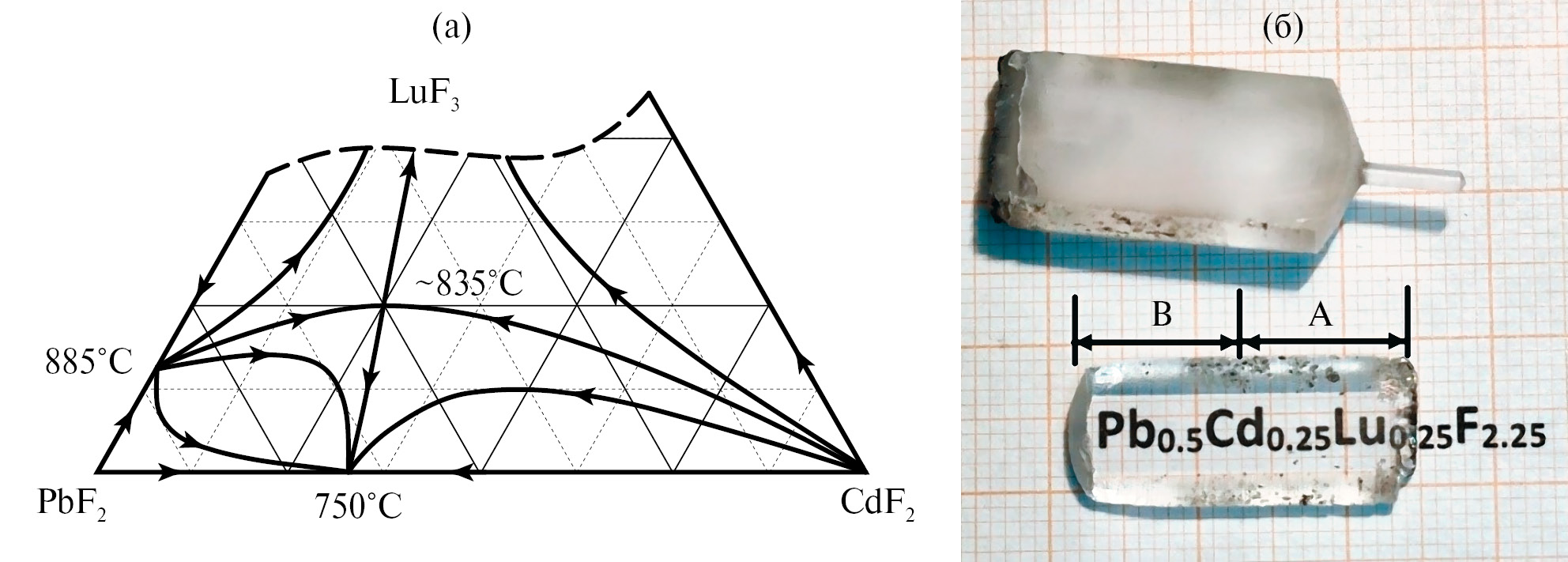 Рис. 1. Область твердого раствора с конгруэнтным характером плавления (седловинная точка) на концентрационном треугольнике PbF2–CdF2–LuF3 (а). Стрелками схематически показан ход кристаллизационных линий на поверхности ликвидуса. Внешний вид кристаллической були Pb0.5Cd0.25Lu0.25F2.25 и пластины, отполированной для исследований (б).