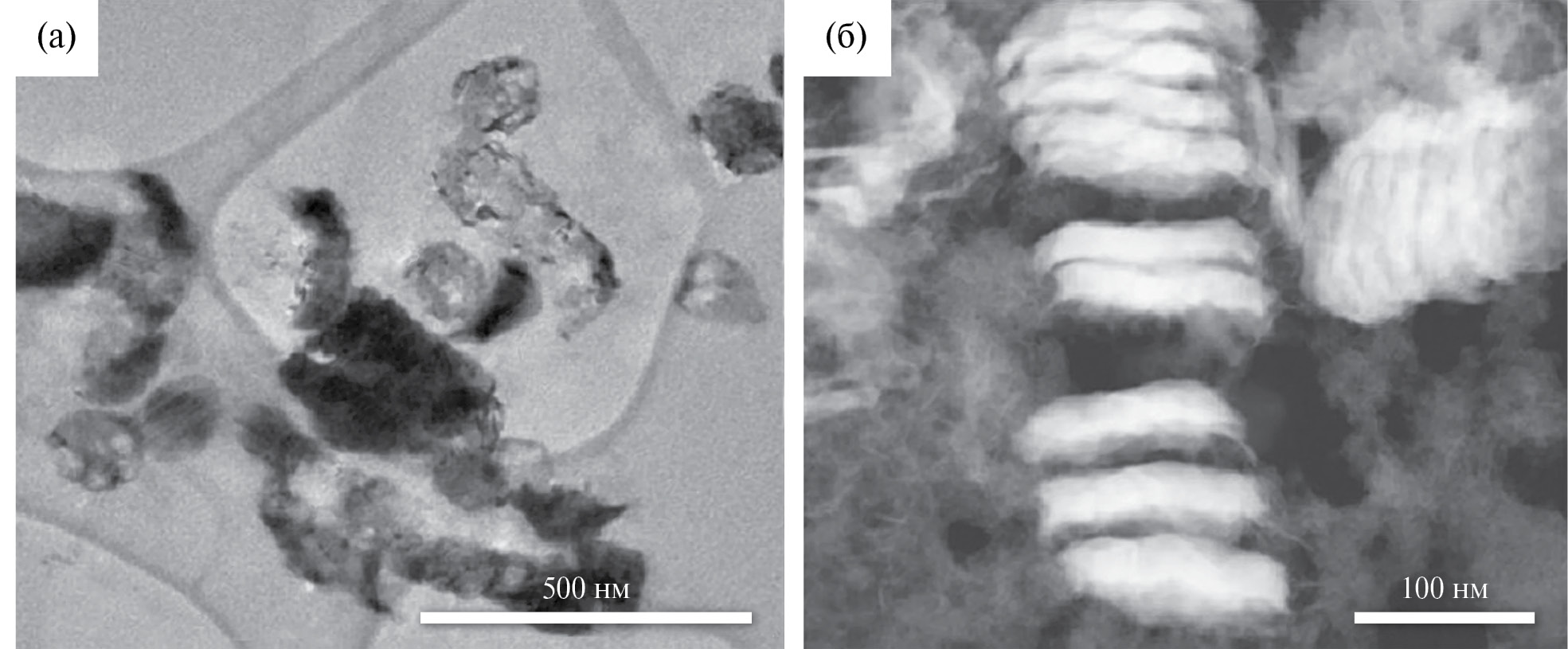 Рис. 3. ПЭМ-изображение никелевых наночастиц (а) и их изображение, полученное с помощью кольцевого темнопольного детектора (б).