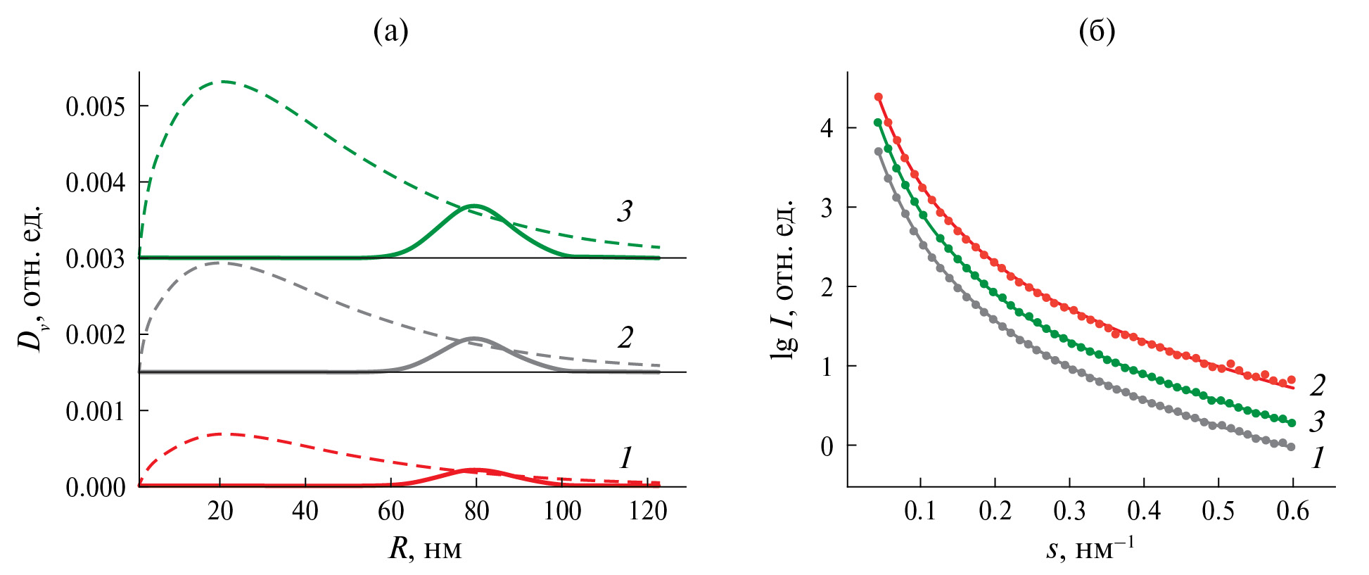 Рис. 4. Объемные распределения частиц по радиусам неоднородностей в сферическом приближении их формы по данным МУРР (а), концентрация частиц в суспензии: 0.05 (1), 0.1 (2), 0.2 (3) мкг/мл. Сплошные линии соответствуют распределению компонента с большим размером, штриховые – с меньшим размером. Сравнение экспериментальных данных с модельными интенсивностями, рассчитанными для распределений на рисунке (а) с учетом непоказанных распределений фракций малых неоднородностей (б). Кривые интенсивности смещены по вертикали для лучшей визуализации.