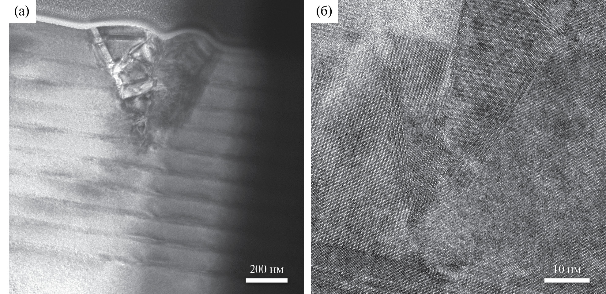 Рис. 3. Дефекты в образце 104 (111)А: а – образовавшийся в середине толщины пленки и прорастающий на поверхность дефект, светлопольное ПЭМ-изображение; б – дефекты двойникования и упаковки, изображение с высоким разрешением.
