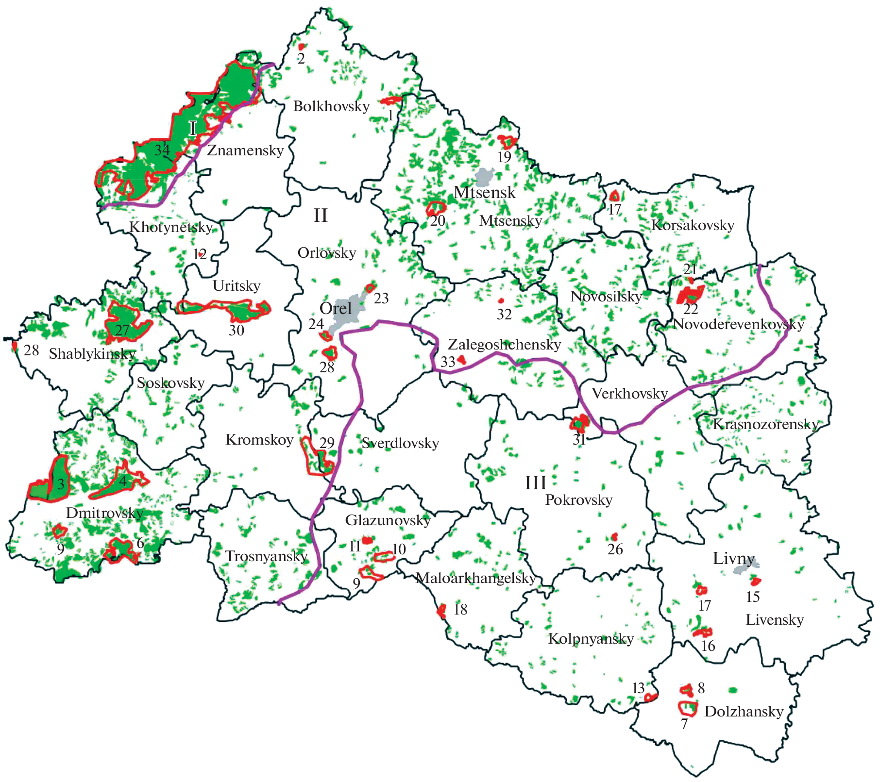 Important Forest Areas are core areas where natural complexes and their biodiversity are preserved. Forests in Orel Oblast are unevenly located. The forest cover is 8%. The following region’s districts, Dmitrovsky, Znamensky, Khotynetsky, and Mtsensky, are the most wooded ones with the forest cover making up 20 to 25%, whereas the lowest forest cover is found in the south-eastern districts Dolzhansky, Kolpnyansky, Livensky, and Pokrovsky, where this indicator barely exceeds 2.5%. The largest forest area has been preserved in the north-western part of the region under study. It belongs to the Orlovskoye Polesye National Park. Broad-leaved forests account for 19 243.42 ha (19.5%), and coniferous/broad-leaved forests account for 79,459.17 ha (80.5%). This study uses the route method, the method of geobotanical descriptions, and grid mapping. Having studied the Orel Oblast areas, we identified 34 Important Forest Areas with the highest diversity of rare and protected plants. There were 8 species listed in the Red Data Book of the Russian Federation, and 58 species listed in the Red Data Book of Orel Oblast.