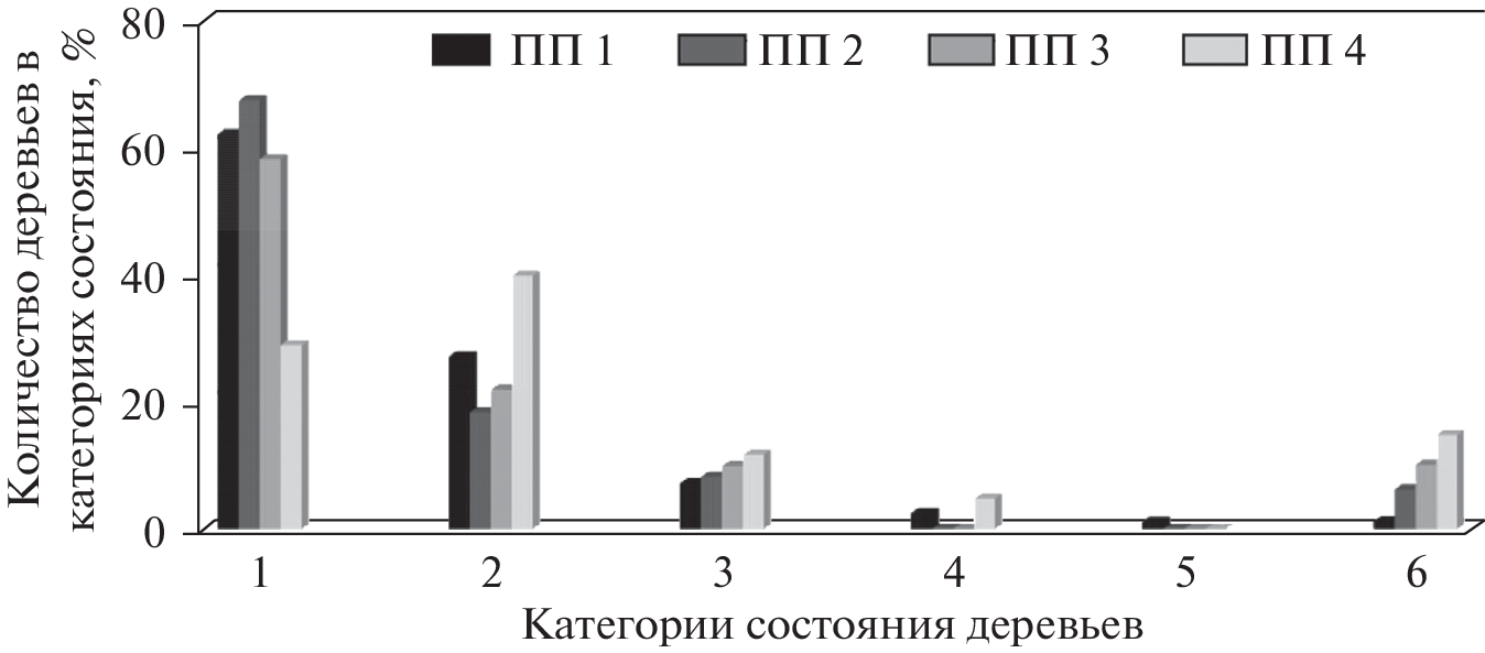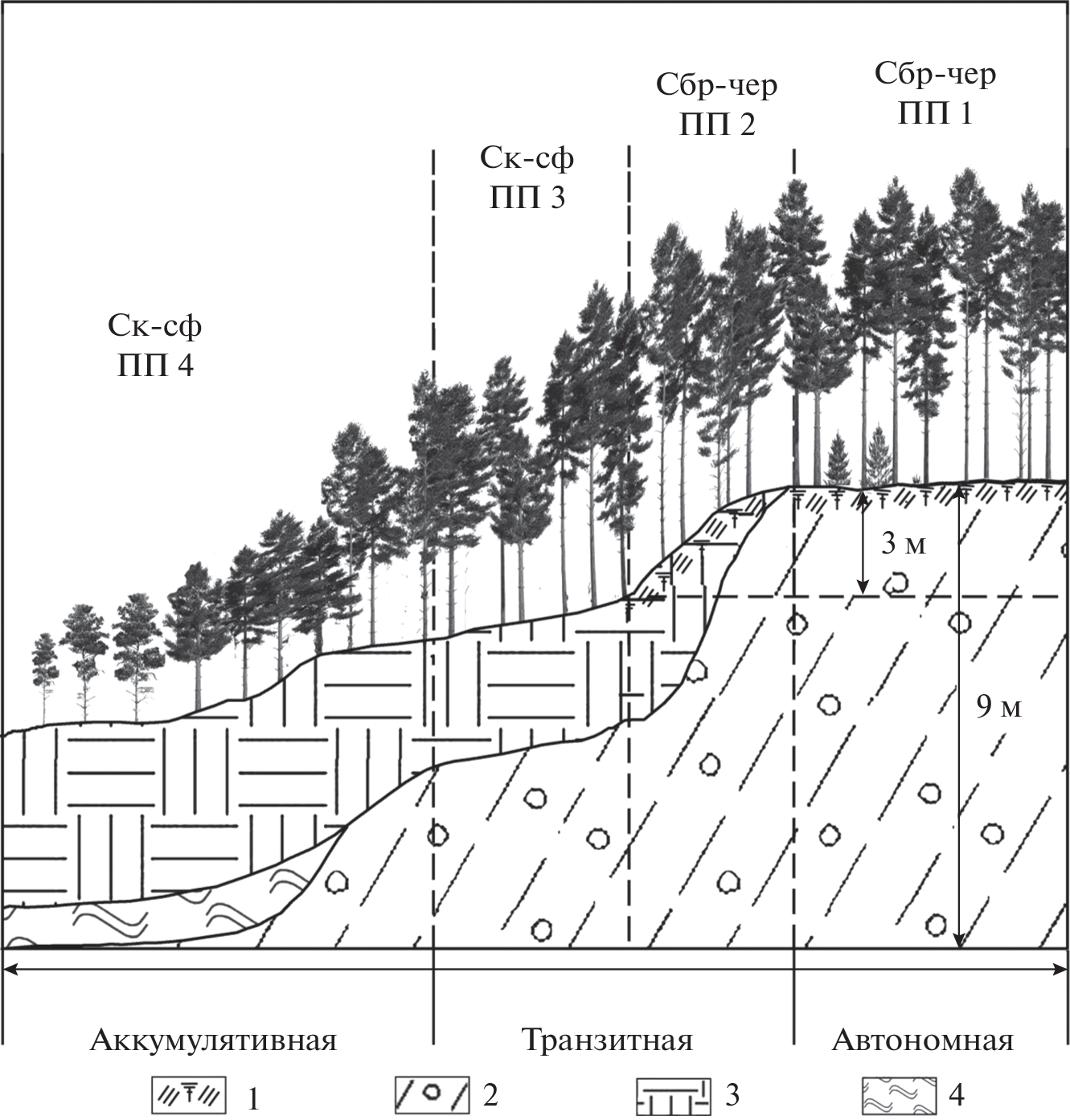 The article presents the results of studies of the pine catena’s stands structure, conducted in the Zapadnodvinsky forestry of the Tver region (Zapadnodvinsky forest-swamp station of the Institute of Forest Science of the RAS, IFS RAS), linking the biogeocenosis of the forest and swamp parts of the oligotrophic bog. The purpose of the research is to study the forestry characteristics, morphometric indices, origin, age structure, dynamic processes and volume indicators of pine stands during the transition of the forest part of the catena to the oligotrophic bog. The pine catena includes four sections with a total length of 110 m and a width of 40 m: the upper forest automorphous zone (PP 1), the slope transit zone (PP 2 and 3) and accumulative zone (PP 4) with forest types changing from cranberry-blueberry pine woods of II quality class to shrub-sphagnum meso-oligotrophic pine woods on 6 m of peat (V quality class), underlain by organic lake sediments. The age structure of stands varies from the conditional evenly-aged restorative dynamics in the forest part to the highly-unevenly-aged dynamics found closer to the climax phase of the meso-oligotrophic sphagnum swamp. The forest part is characterized by the better condition indicators’ values, while the oligotrophic bog’s stands have the worst ones. The pine biogeocenosis of an oligotrophic sphagnum bog is close in dynamic characteristics to sustainable climax forest communities with a maximum age of the first generations trees of approximately 240–280 years. The stands condition along the catena profile varies from healthy in the forest part to the weakened with the degradation development dynamics in the accumulative part of the sphagnum bog.