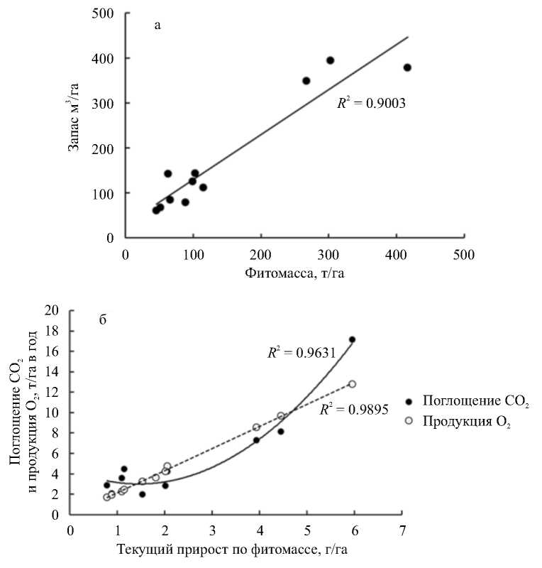 Рис. 2. Зависимость запаса древесины от фитомассы (а), а также годичного поглощения углекислого газа и продукции кислорода от текущего прироста фитомассы (б) в искусственных насаждениях с участием дуба в Майкопском лесничестве.