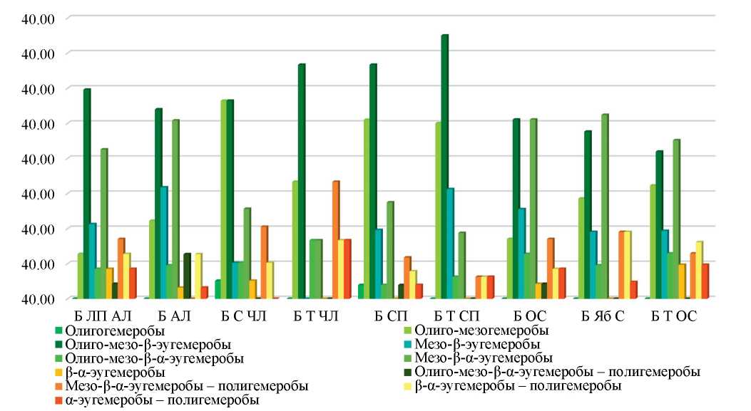 В спектре гемеробии лесополос доминируют олиго-мезо-β-эугемеробы (тысячелистник обыкновенный (Achillea millefolium L.), репешок аптечный (Agrimonia eupatoria L.), пупавка красильная (Anthemis tinctoria L.), василек узкочешуйчатый (Centaurea stenolepis A. Kern.), ежа сборная (Dactylis glomeratа L.), девясил британский (Inula Britannica L.), бедренец камнеломка (Pimpinella saxifragа L.), мятлик дубравный (Poa nemoralis L.), лютик многоцветковый (Ranunculus polyanthemos L.), звездчатка злаковидная (Stellaria graminea L.) и др.) и лишь в лесополосах Береза-Тополь, Береза-Яблоня и чистая Береза (ОС) преобладают мезо-эугемеробы. Общий анализ флоры лесополос с березой по спектру гемеробии показал, что второй и третьей по численности группами являются олиго-мезогемеробы (колокольчик скученный (Campanula glomeratа L.), колокольчик крапиволистный (C. trachelium L.), осока колосистая (Carex contigua), дремлик чемерицевидный (Epipactis helleborine (L.) Crantz), земляника лесная (Fragaria vesca L.), подмаренник душистый (Galium odoratum (L.) Scop.), чина весенняя (Lathyrus vernus (L.) Bernh.), купена многоцветковая (Polygonatum multiflorum (L.) All.) и др.) и мезо-эугемеробы (икотник серо-зелёный (Berteroa incana (L.) DC.), свербига восточная (Bunias orientalis L.), ясколка костенцовая (Cerastium holosteoides Fr.), иван-чай узколистный (Chamaenerion angustifolium (L.) Scop.), цикорий обыкновенный (Cichorium intybus L.), короставник полевой (Knautia arvensis (L.) Coult.), хатьма тюрингенская (Lavatera thuringiaca (L.) Vis.), мятлик луговой (Poa pratensis L.) и др.) (рис. 2).