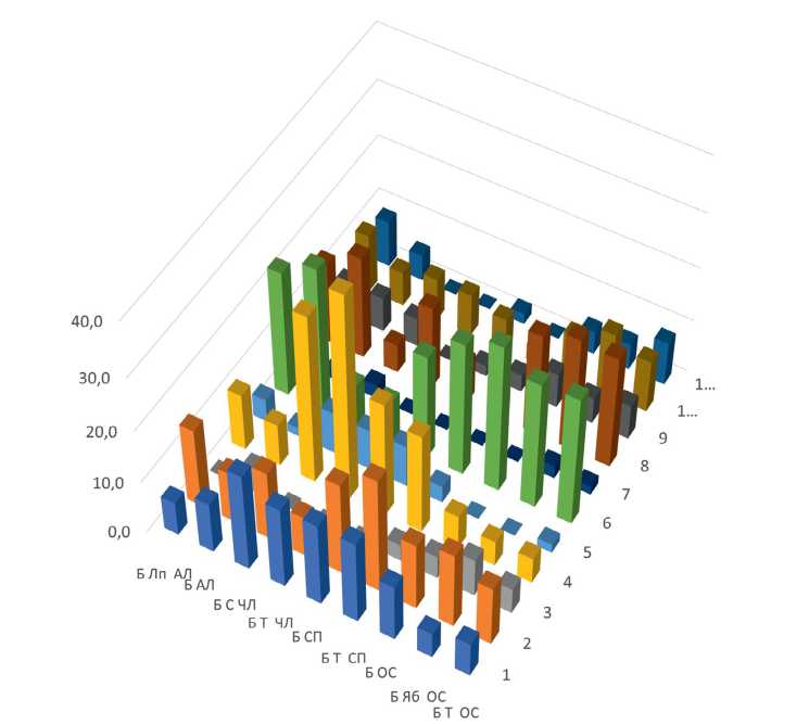 Формула древостоя | 9Б1Лп | 10Б | 7Б3С | 7Т3Б | 6Т4Б | 6Т4Б | 10Б | 9Б1Яб | 5Б5Т |
