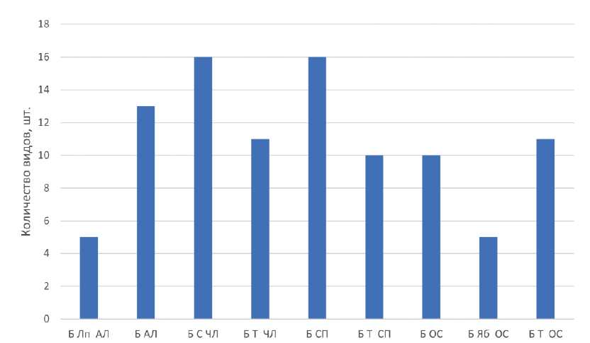 Общее количество видов в лесополосах варьирует, максимальное число видов (63) выявлено в чистой березовой лесополосе АЛ, минимальное (13) — в лесополосе береза-тополь ЧЛ. При этом количество видов положительно коррелирует с длиной лесополосы (0.67). Ведущими семействами во флоре лесополос являются Сложноцветные (22 вида), Шиповниковые (14), Бобовые (10), Сельдерейные, Мятликовые (по 9 видов), Капустные, Гвоздиковые, Норичниковые (Scrophulariaceae) (по 5 видов), Яснотковые, Ивовые (Salicaceae) (по 4 вида). Во всех лесополосах с березой повислой представлены виды четырех семейств: Сложноцветных, Шиповниковых, Сельдерейных, Березовых (Betulaceae), в восьми из девяти изученных лесополос — виды семейств Бобовых, Мареновых (Rubiaceae), Молочайных (Euphorbiaceae), в семи лесополосах — виды семейств Мятликовых, в шести — Кленовых (Aceraceae), Осоковых (Cyperaceae), Ивовых (Salicaceae) (рис. 1).