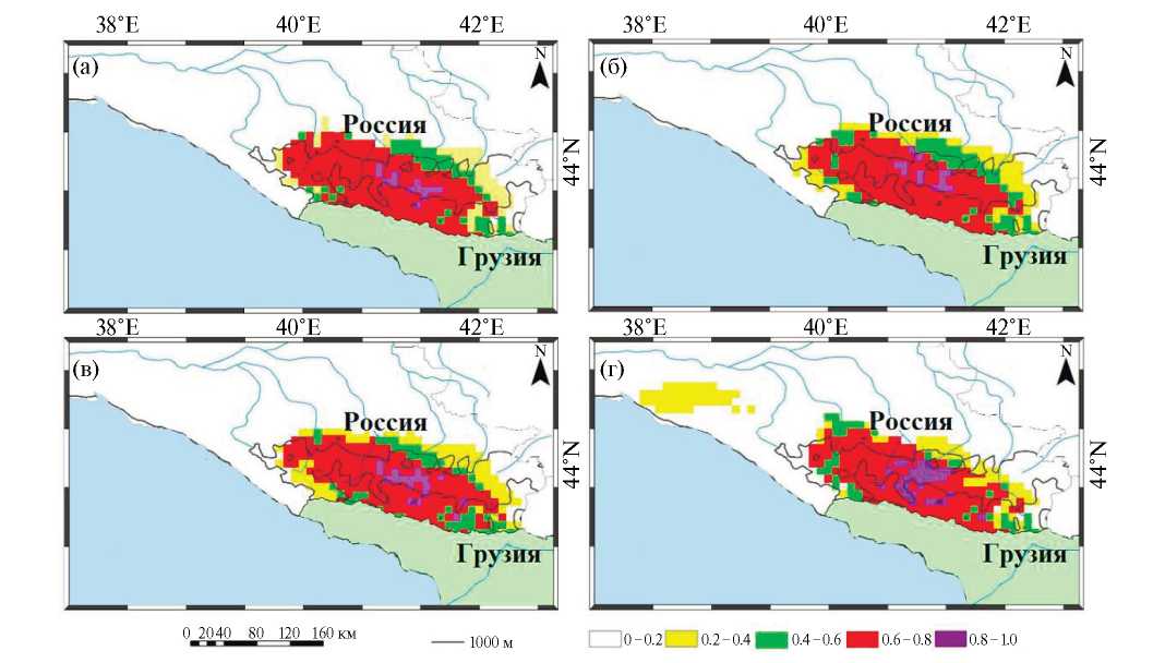 Примечание. Цветовые градации показывают уровень вероятности обнаружения вида от 0 до 1 (0—100 %).