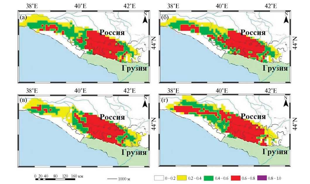 Рис. 1. Изменение области распространения почвенно-подстилочной формы D. sсhmidti при 4 климатических сценариях: а — RCP 2.6, б — RCP 4.5, в — RCP 6.0, г — RCP 8.5.