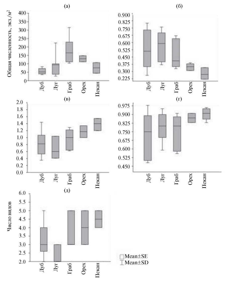 Рис. 2. Синэкологические характеристики таксоценов дождевых червей, обитающих в гирканских лесах: (а) — общая численность таксоцена, (б) — индекс Симпсона, (в) — индекс Шеннона, (г) — индекс Пиелу, (д) — видовое богатство.