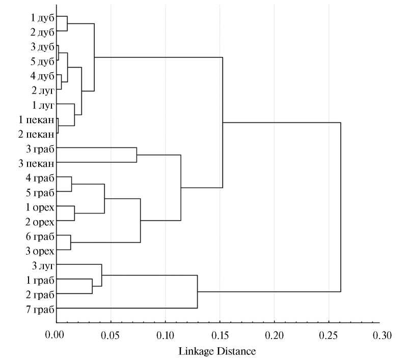 Кластерный анализ. Сравнение морфо-экологической и хорологической структуры населения дождевых червей с помощью метода Уарда показало: выборка достоверно делится на три кластера (рис. 5). К первому относятся таксоцены дубрав, двух луговых участков, расположенных среди леса, и двух пекановых биогеоценозов. Они характеризуются наименее вариабельной хорологической и морфо-экологической структурой и небольшой общей численностью. Грабовые таксоцены дистанцируются на второй и третий кластеры. Ко второму кластеру относятся маловидовые сообщества с выравненной средней численностью и более богатые таксономически, но вариабельные по численности. На разных уровнях они группируются с черноореховыми таксоценами. Третий кластер — с выраженным доминированием одной морфо-экологической и хорологической группы, к которому помимо трех грабовых относится краевой луговой таксоцен.