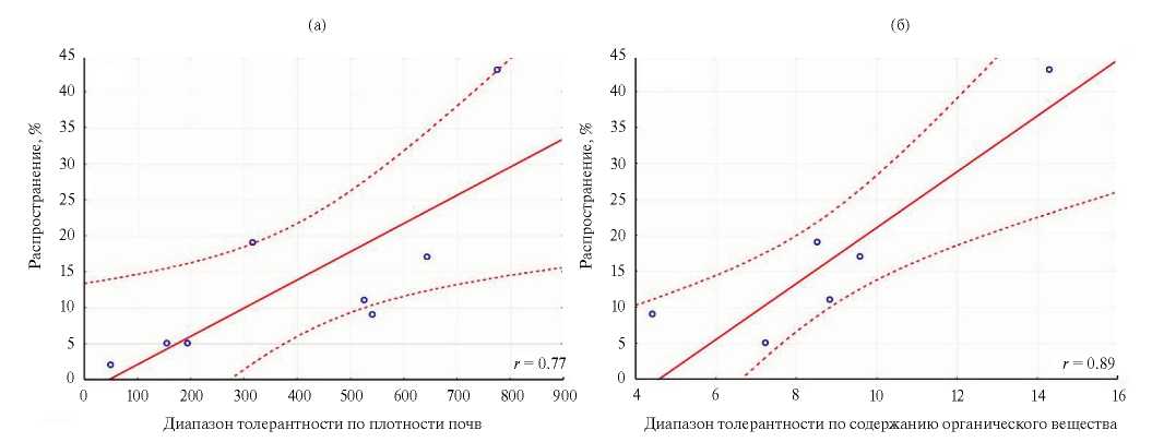 Выявлены значимые корреляции между распространением видов дождевых червей и шириной диапазонов толерантности к содержанию органического вещества в почве (рис. 4а) и к плотности почв (рис. 4б).