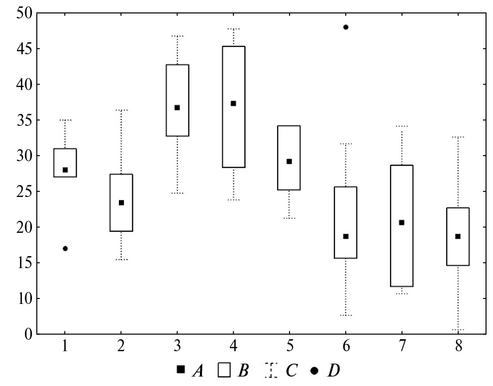 Примечание. По оси абцисс – типы леса (1 – дубравы неморальнотравные; 2 – осинники неморальнотравные; 3 – черноольшаники крупнопапоротниковые; 4 – грабовые неморальнотравные; 5 – грабово-буковые неморальнотравные; 6 – буковые горноовсянницевые; 7 – буковые крупнопапоротниковые леса; 8 – буковые ежевичные); по оси ординат – число видов: A – медианы, В – диапазоны между квартилями, С – диапазоны между минимумом и максимумом, D – выбросы.